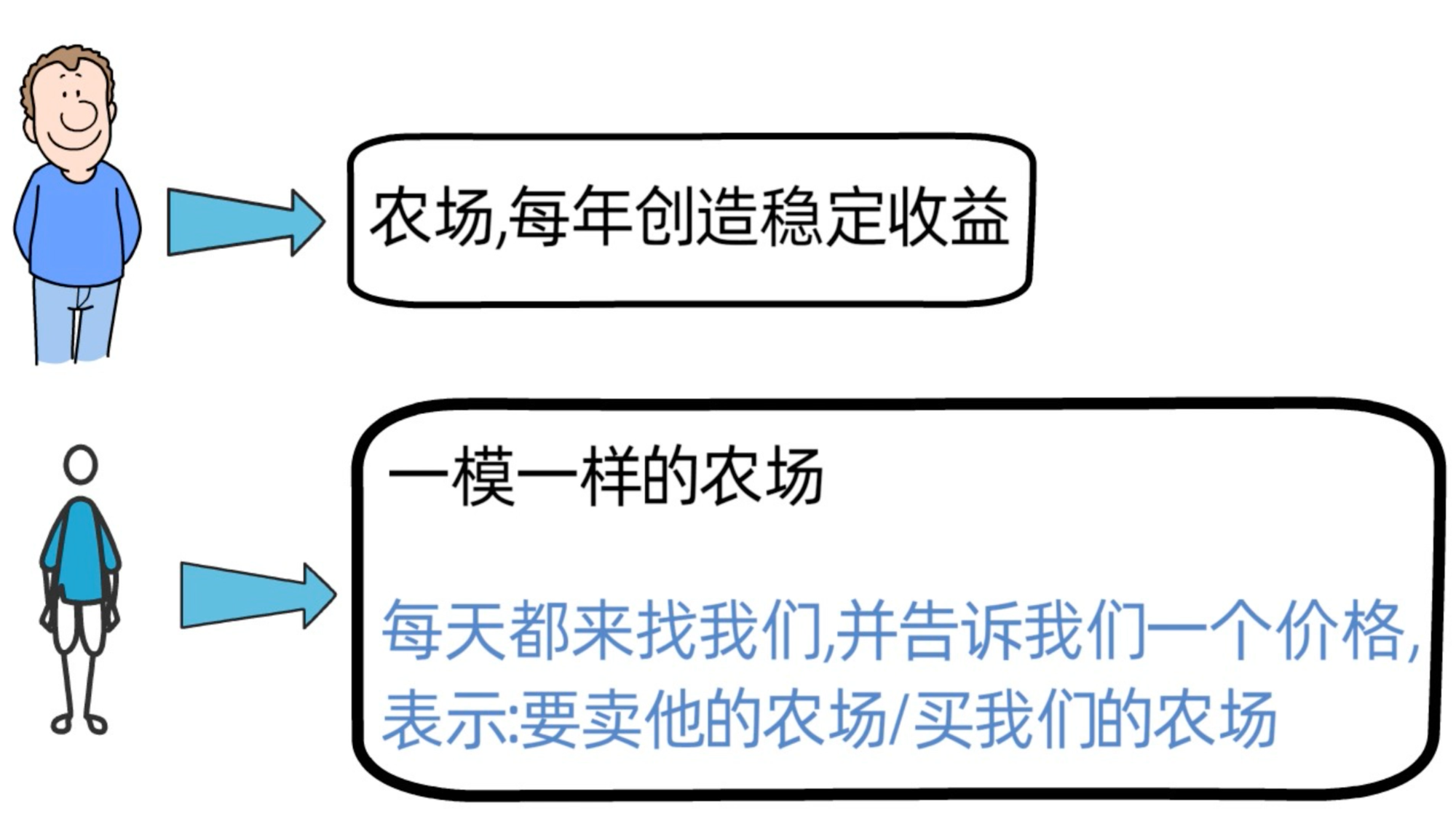 假设我们买了一个农场,它每年都会给我们创造稳定的收益。我们农场旁边有个农场主,叫市场先生,和我们拥有一模一样的农场。他为人十分热情,每天都会过来找我们,告诉我们,他要以某个价格,将他的农场卖给我们,或者买我们的农场。