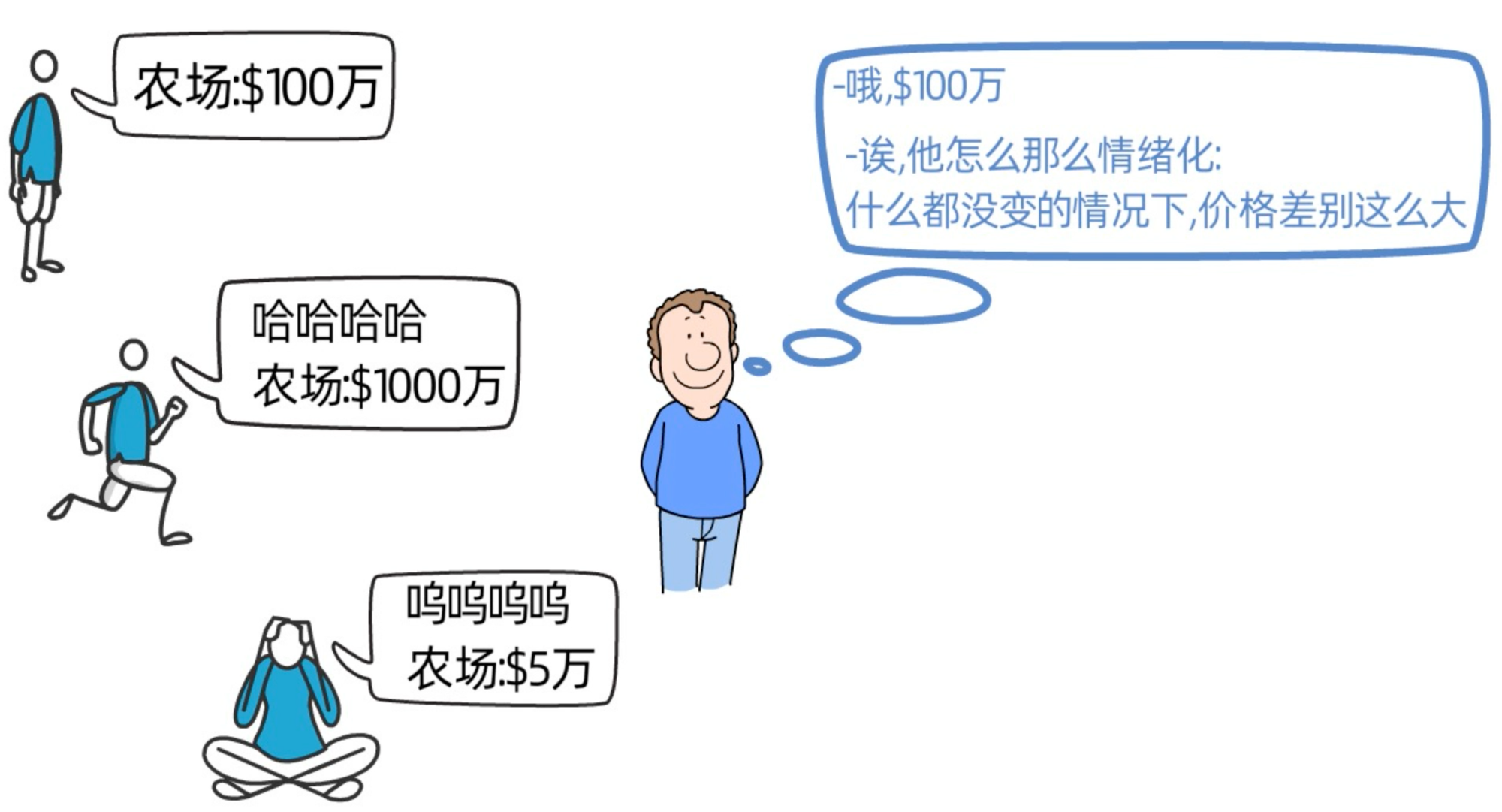 刚开始他向我们报价1百万,前几周的价格虽然会有些许的波动,但都差别不太大。此时,我们可能会觉得自己的农场价值100万。但和市场先生相处一段时间后,我们就会发现,他的报价十分不理性,并不是基于农场价值,而是基于情绪。在半年的时间内,即便我们农场和农作物都没有发生任何变化,他依然会依据他的心情随意开价。有时,他心情好,会兴奋的过来告诉我们,农场价值1000万;有时,他心情沮丧,会拖着沉重的脚步过来找我们,说农场价值5万,比我们农场每年的净利润还低。