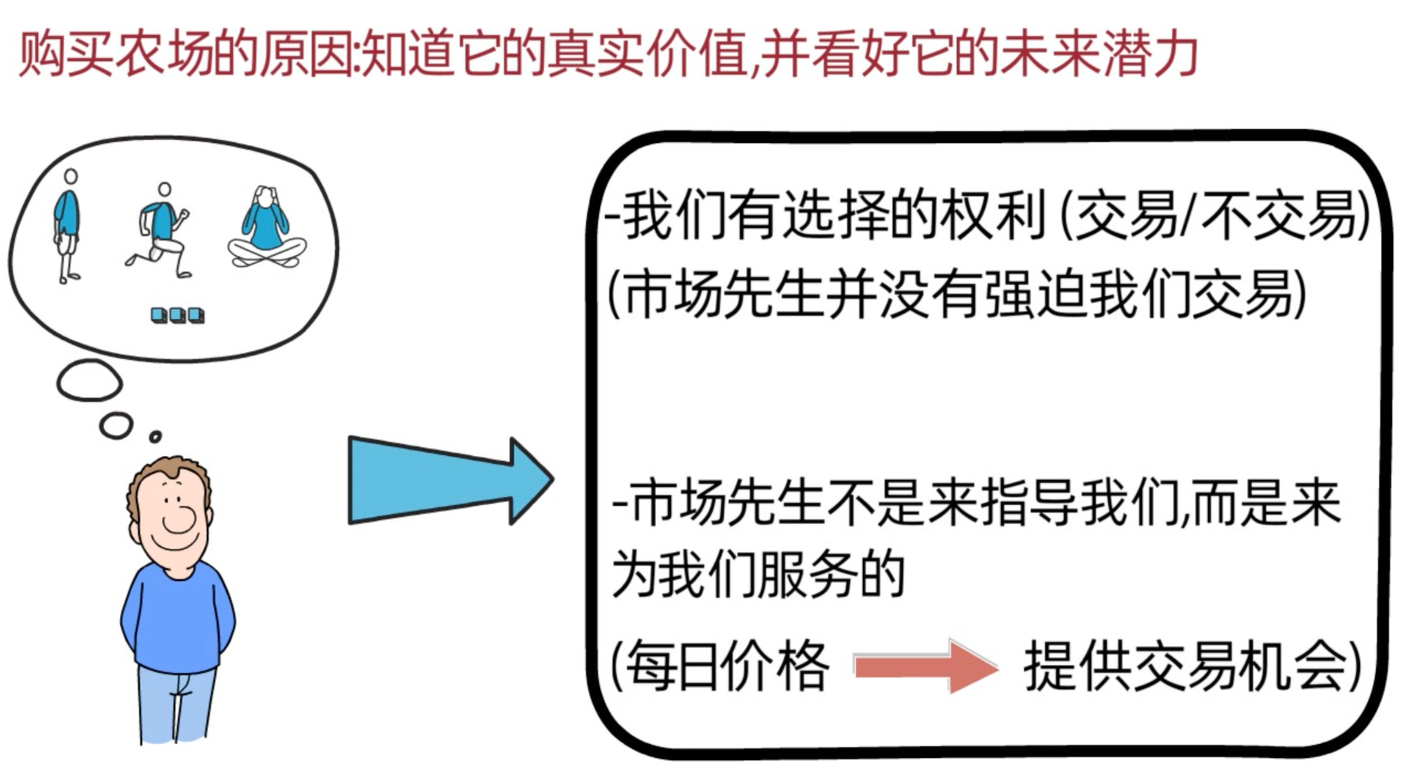 我们之所以购买这个农场,是因为我们清楚它的内在价值,并看好它的未来潜力。那面对每天都来报价,情绪不稳定的市场先生,我们该怎么办呢?