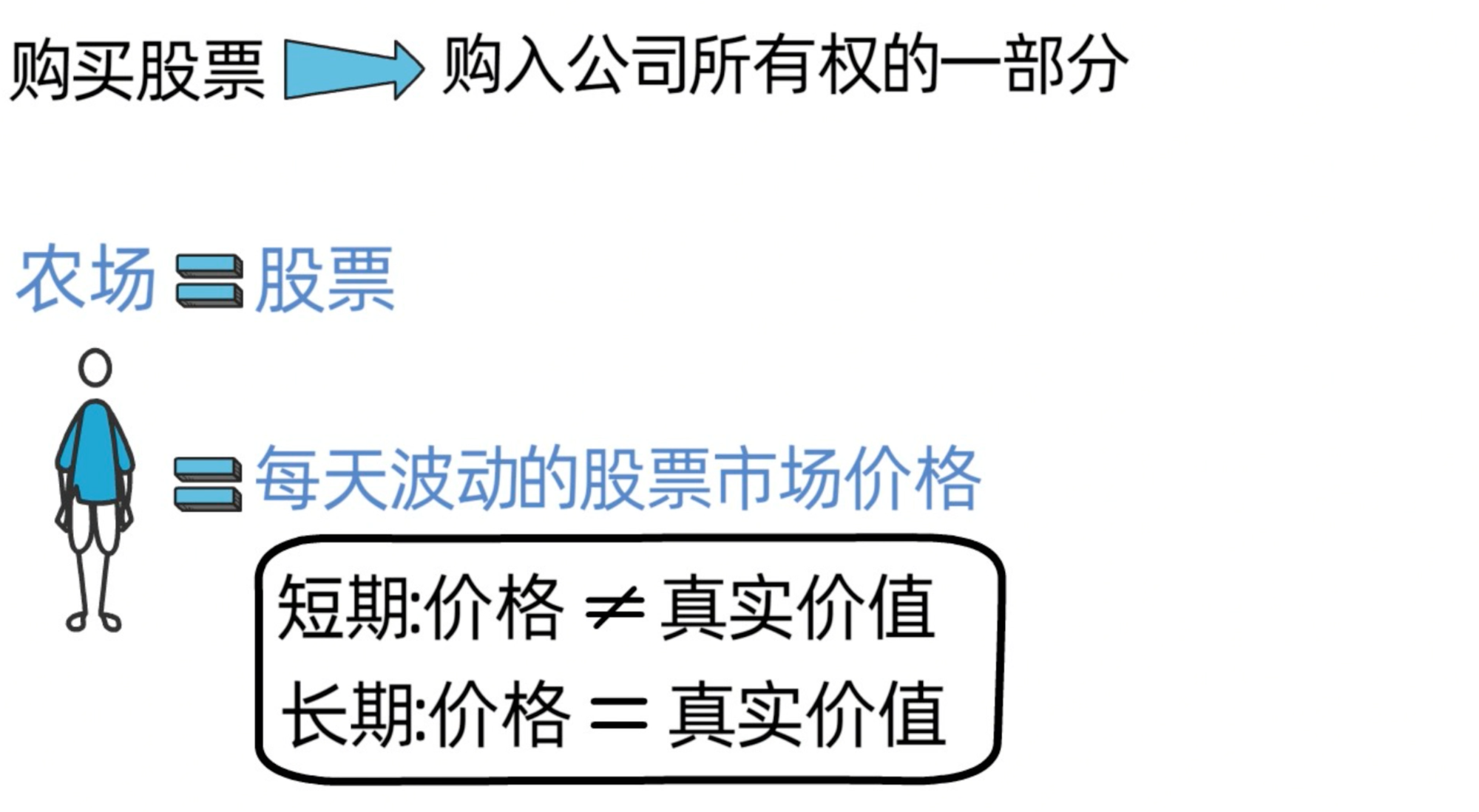 在上一期内容里,我们曾分享过,购买股票,本质上就是购买公司所有权的一部分,这个假设里的农场,就相当于我们的股票;假设里的市场先生,相当于每天波动的股票市场报价,这些报价短期来看往往充满情绪波动,并不等于公司的真实价值;但从长期来看,价格终将回归公司的真实价值。