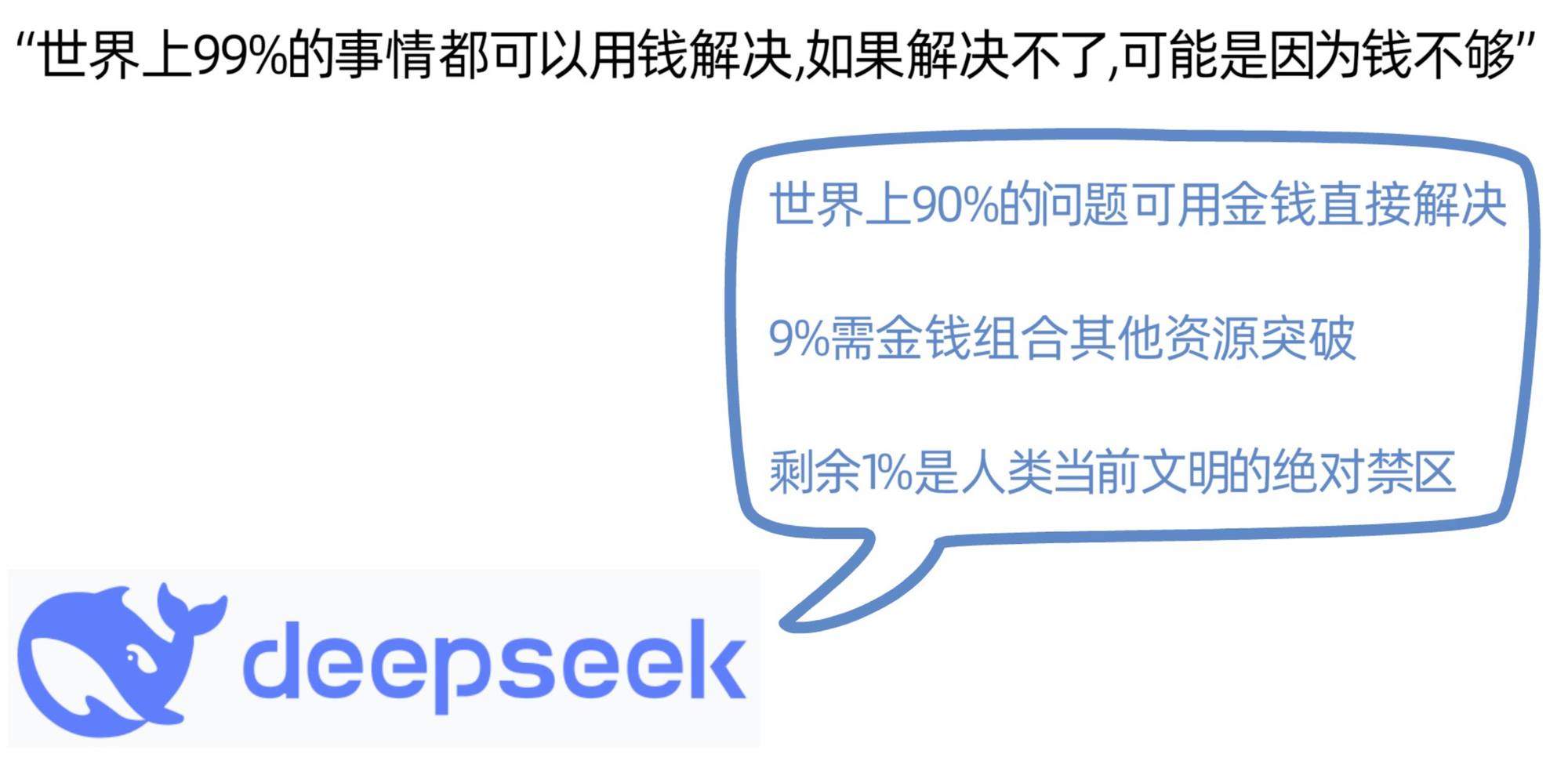 -因为金钱可以解决我们面临的所有关于钱的问题,拥有金钱是件很好的事。我觉得有句话说的好,“世界上99%的事情都能用钱解决,如果没法解决,可能是因为钱不够。”这句话可能有点绝对,所以我顺便问了下deepseek,得到了相对更完善的结论,“世界上90%的问题可用金钱直接解决,9%需金钱组合其他资源突破,剩余1%是人类当前文明的绝对禁区。”