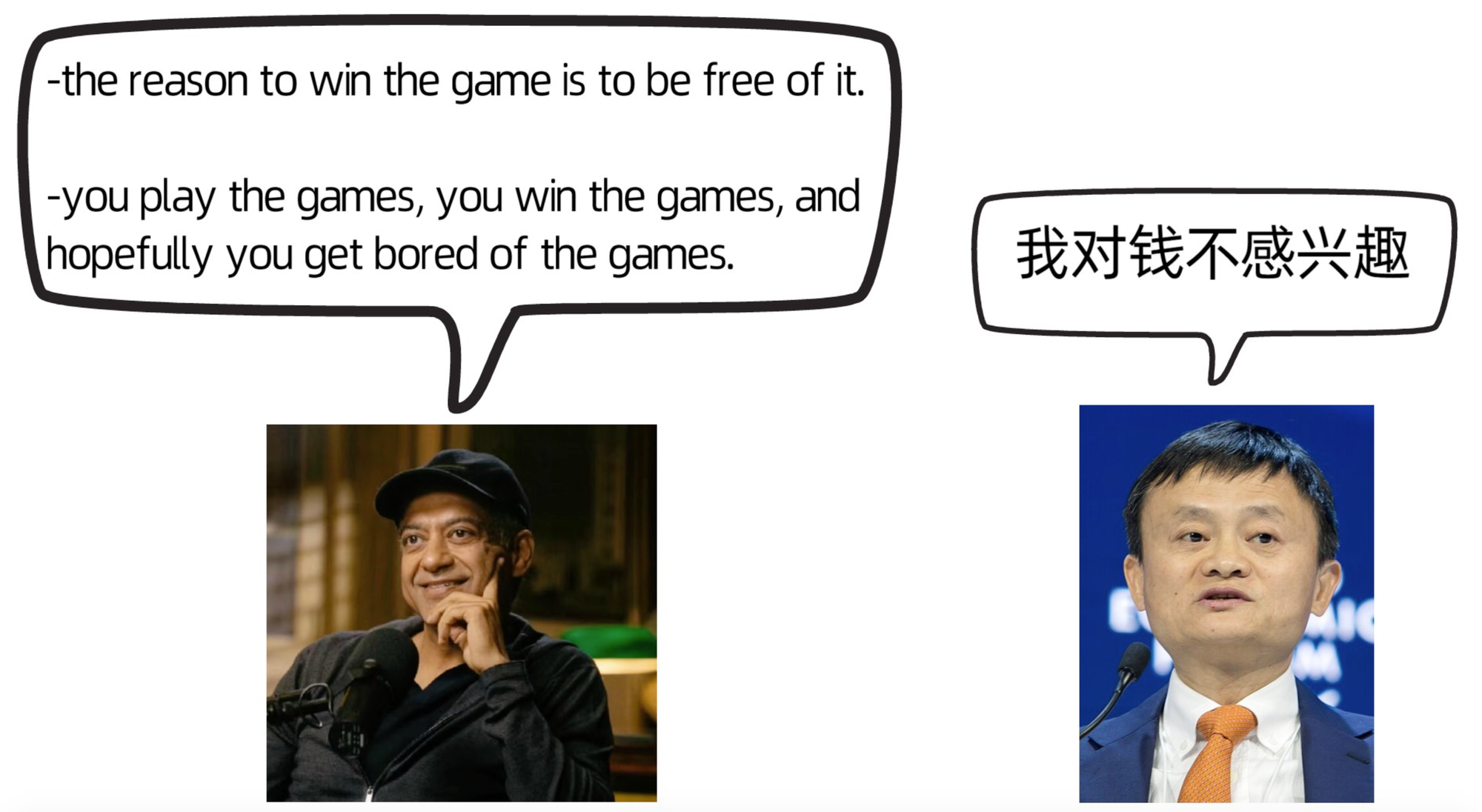 -除了金钱可以解决很多问题外,naval表示,当我们获得了物质上的成功,才有机会从金钱游戏中获得解脱,去全身心的追求对我们更为重要的事。我对他说的有句话印象很深刻,“the reason to win the game is to be free of it. You play the games, you win the games, and then hopefully you get bored of the games”,赢得金钱游戏的目的是为了从中获得解脱,当我们获得了足够多的财富,才会真正的看淡它,这就好比马云在成功后说的“我对钱不感兴趣”。参与金钱游戏,征服金钱游戏,看透金钱游戏,然后从中获得解脱。