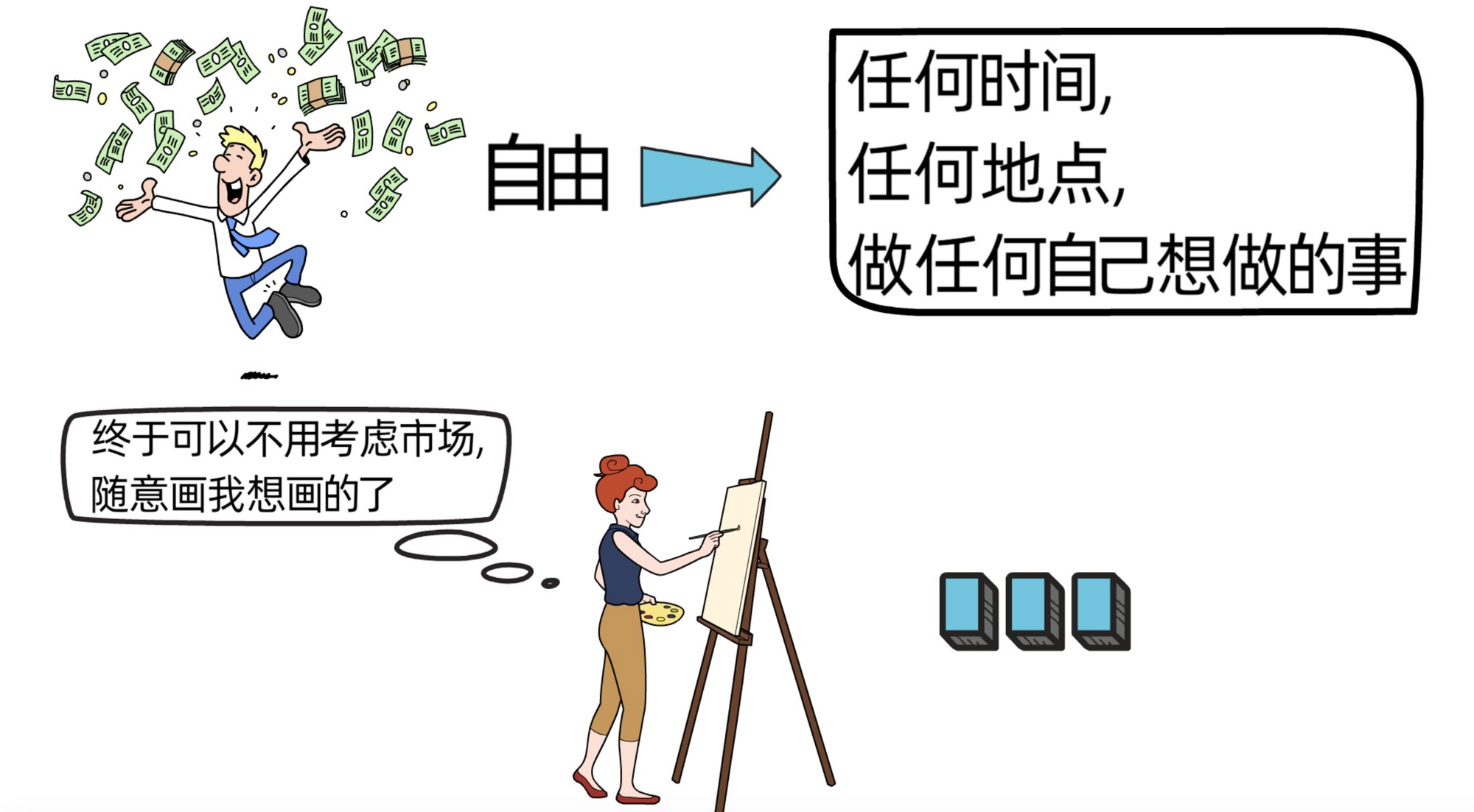 当我们在金钱游戏中获胜,获得了财富的同时,我们也让自己获得了自由,也就是可以在任何时间任何地点做任何自己想做的事,此时,我们可以更加专注于对于我们来说更重要的事,例如去追求个人理想,去做真正自己想做的事。比如,艺术创作者可以不再为了生计而创作,可以更加全身心的创作自己想创作的作品,而不用再苦恼自己的下一顿生活费在哪。
