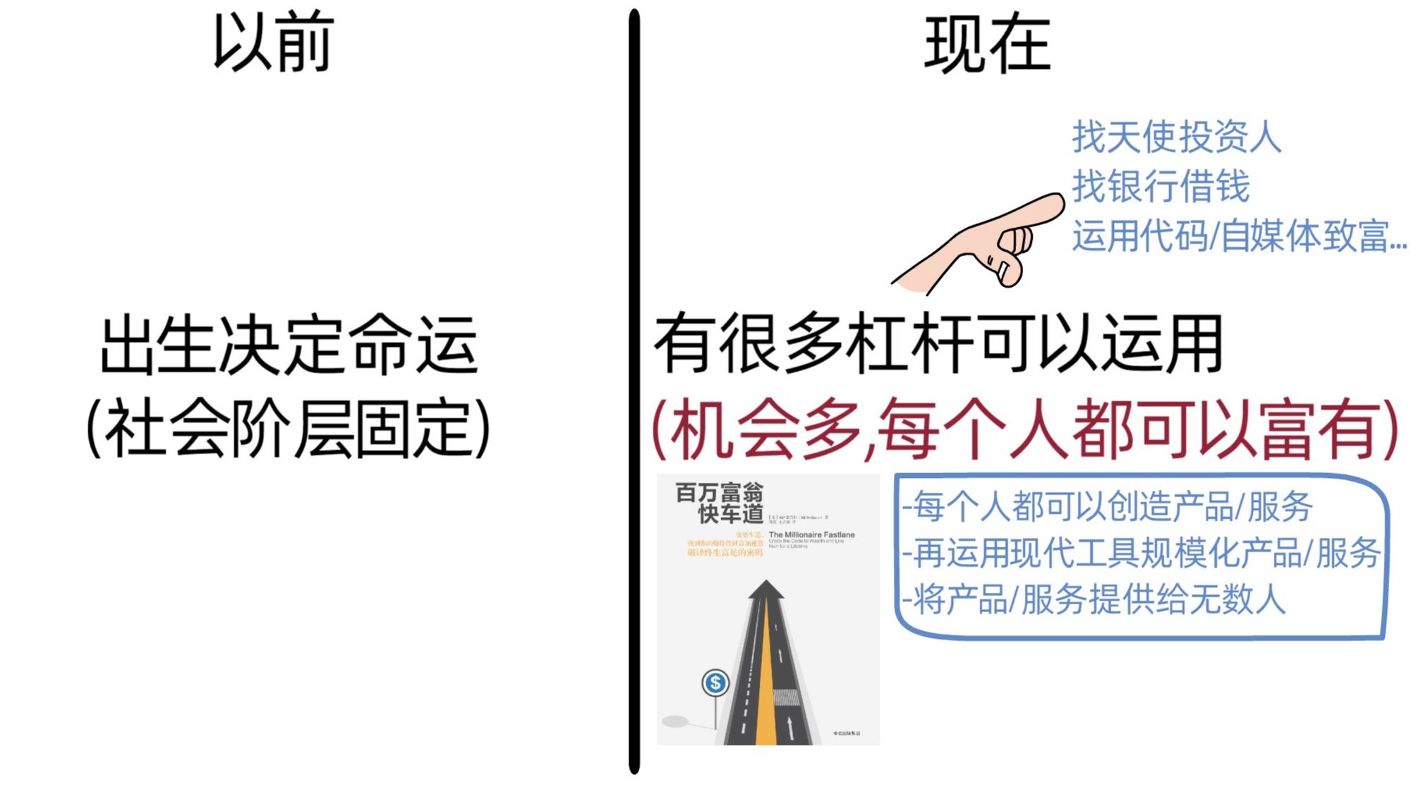 在过去,你出生时父母做什么可能你这辈子就做什么,出生决定命运,社会阶层是固定的,但现在却不是这样。现在的社会有很多杠杆可以运用,比如,我们可以找天使投资人来投资我们的项目,找银行借钱创业,或者运用代码,自媒体等现代工具致富等,机会很多,虽然依然需要我们耐心去寻找社会需求和认真行动,但每个人都可以变得富有,我们每个人都可以创造一个产品或者服务,然后运用现代工具去规模化这些产品或服务,把他们提供给无数多的人(推荐各位可以看下《百万富翁快车道》这本书,或者我关于这本书的分享,可能会给各位提供一些关于如何创造财富的想法)。