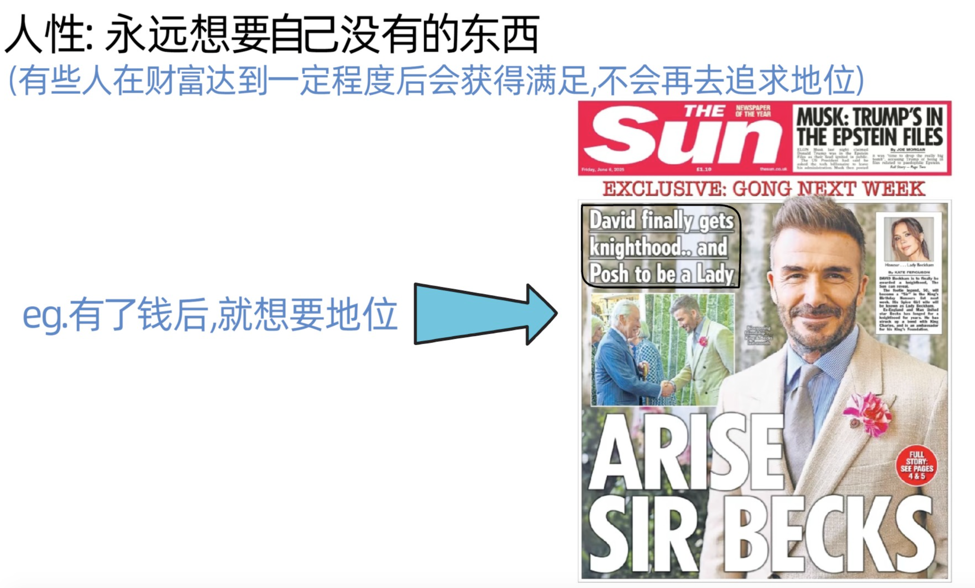 当然,人性永远都是想要自己没有的东西。当人们有钱后,会开始追求地位,(这让我想起了足球明星贝克汉姆在获得财富后努力追求英国爵士头衔22年的事),不过,naval表示,有些人在财富达到一定程度后会感到满足,不会再去追求地位。