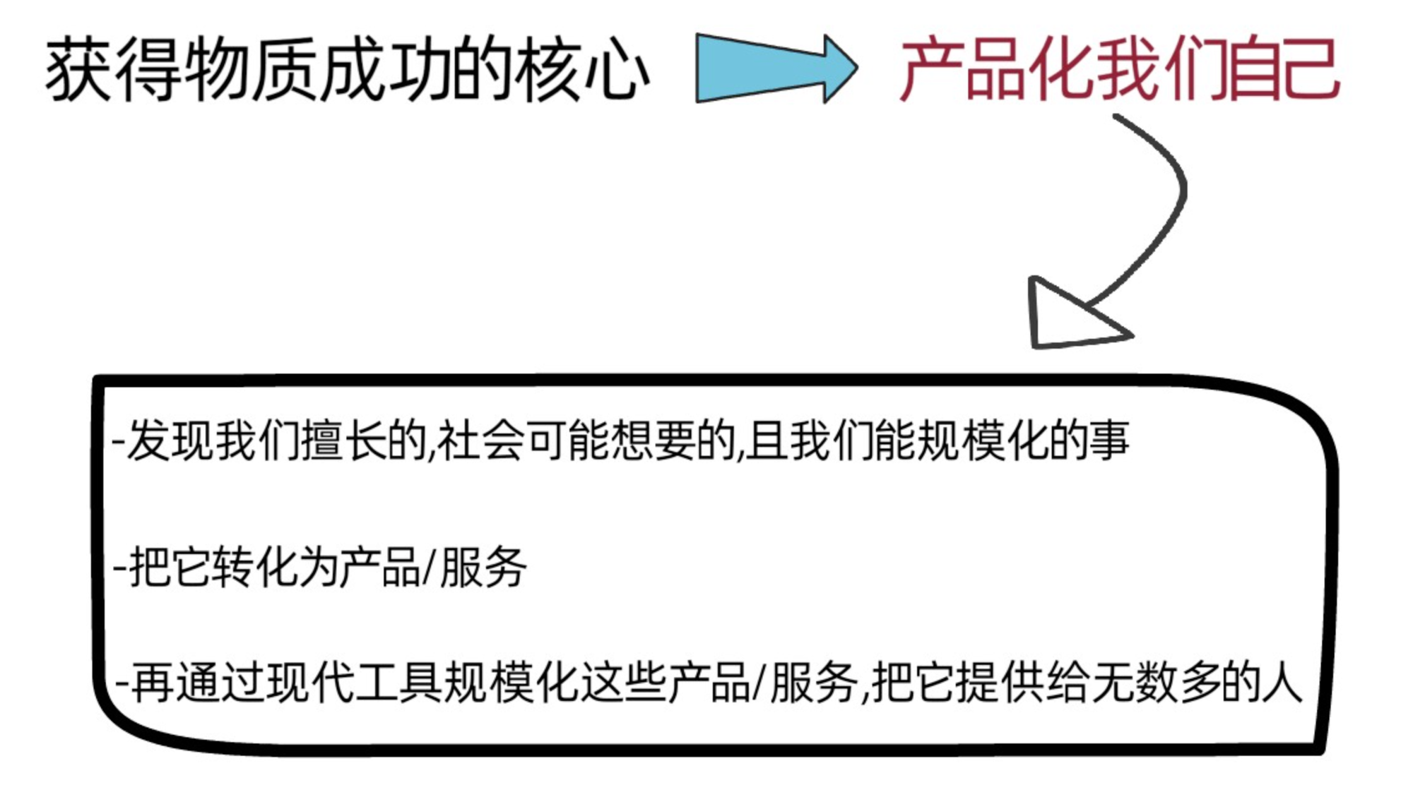 Naval表示,获得物质成功的核心是,“产品化我们自己”,仔细去发现那些我们擅长的,社会可能想要的,且我们能够规模化的事,然后把它转化成产品或服务,通过现代工具去规模化它们,把它们提供给无数多的人。