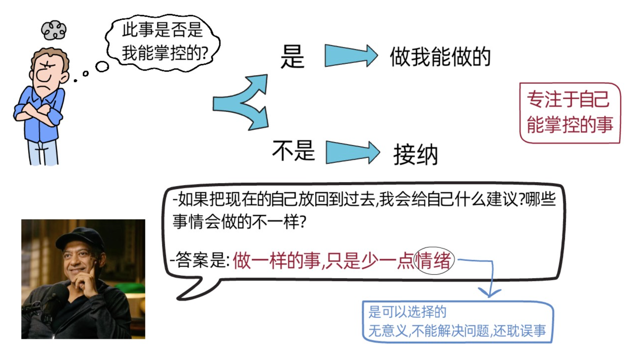 Naval喜欢回顾自己的过去,把现在的自己放回到5年前,10年前,15年前等,然后问自己,我会给曾经的自己怎样的建议,以及哪些事情会做的不一样(不是如果回到过去,要多买哪些股票或者买比特币之类的事,而是把拥有现在性情和经历的自己放回到过去来思考自己的处事方式和态度)。对于naval来说,回顾自己的曾经,他依然会和过去做一样的事,只是做的时候少一点情绪,因为情绪对于人来说是可以选择的事项,不是我们必须要产生的。 Naval认为,相对于拥有不必要情绪的人来说,那些能以更加平静的心态做事的人可能会更加高效和开心。
