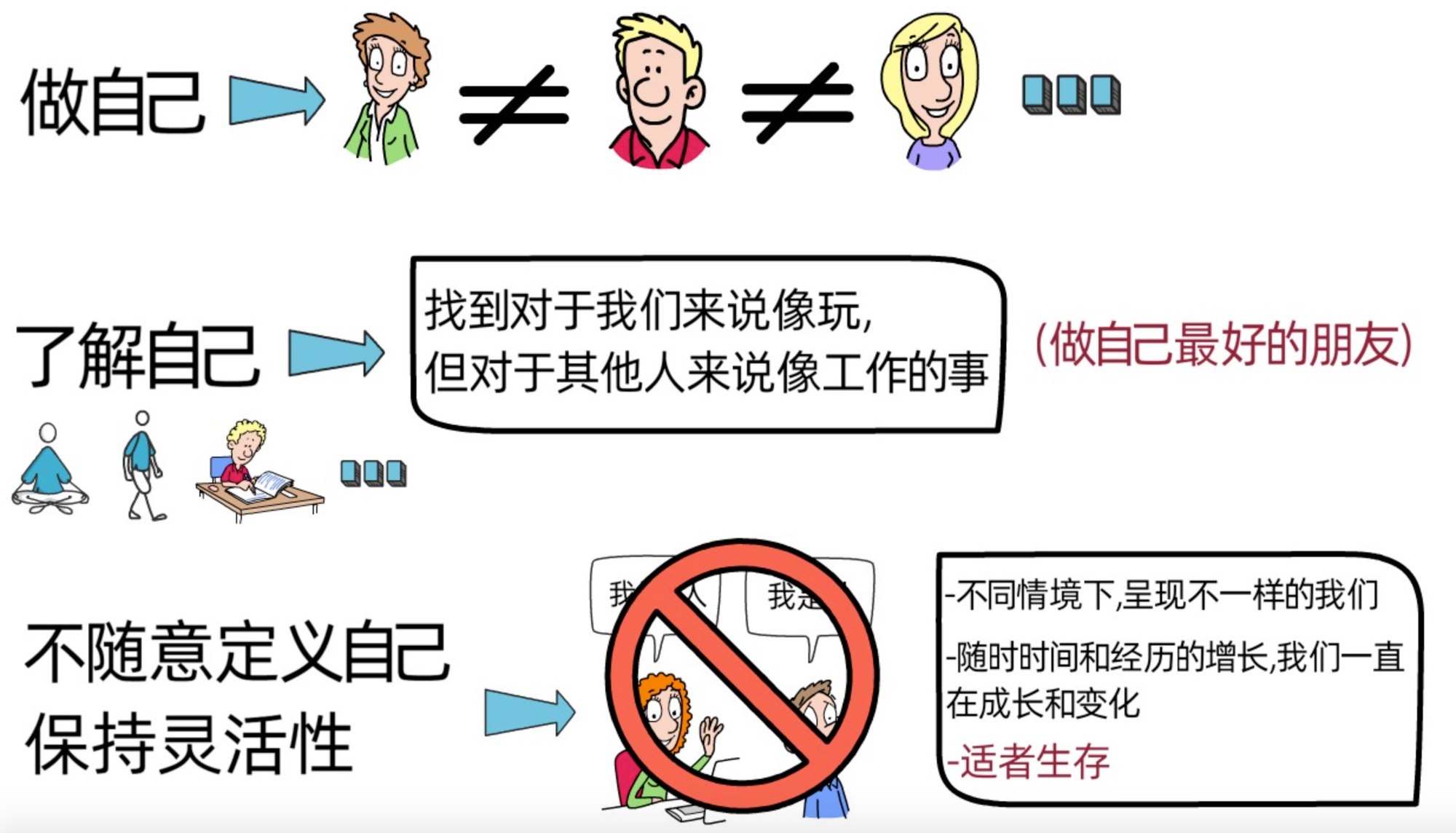 同时也不要随意的定义自己,把自己局限了。比如,很多人喜欢以自己是内向的,外向的,乐观的,或者悲观的来定义自己,naval表示,其实人是复杂且动态的,可能在面对陌生人时我们是内向的,面对熟悉的朋友时我们是外向的,而且随着年龄和阅历的增长,我们的观点和想法都在改变,人也在成长和学习,可能也会逐渐的由内向转为外向。所以,不要随意给自己贴标签,始终对自己的发展和成长保持开放的心态,保持自己的灵活性,这样才有能力适应这千变万化的世界,适者生存,能适应才是王道。