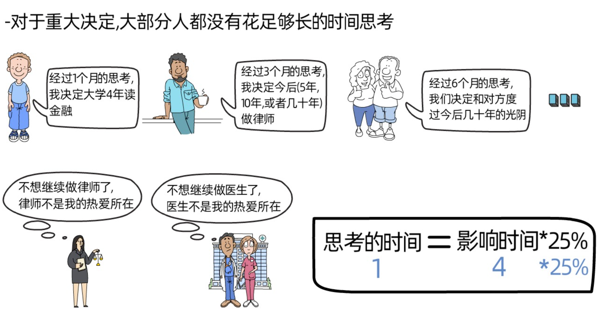 naval表示,他发现一个很有趣的现象,那就是大部分人在面对会影响我们几年,十几年,甚至几十年的决定时,都没有花足够长的时间思考,比如,很多人花1个月左右的时间思考大学4年要读什么专业,花2-3个月的时间思考今后5年,10年要做的工作,花6个月到1年的时间思考是否和某个异性度过今后几十年的时光。在naval看来,对于一些会影响我们今后几年,十几年,甚至几十年的重大选择,最大的错误就是,在未充分准备或缺乏必要信息时过早做出承诺,比如,很多人毕业后选择去做律师或者医生,做了5年或者10年后才发现所做的职业不是自己想做的,更不是自己热爱的。所以,为了避免将来后悔,耽误更多时间,naval建议,思考某个决定的时间按照此项决定会影响我们今后多久的25%来计算,也就是说,如果我们要做一个4年的决定,前期最好花一年的时间去思考和决定。至于我们曾经已经做了的决定,如果此项决定还会继续影响我们很久,我们可以按照刚刚的方法,重新花足够长的时间再思考下是否要改变这个决定,改变永远不晚,改变的最好时机一个是过去,另一个就是现在。