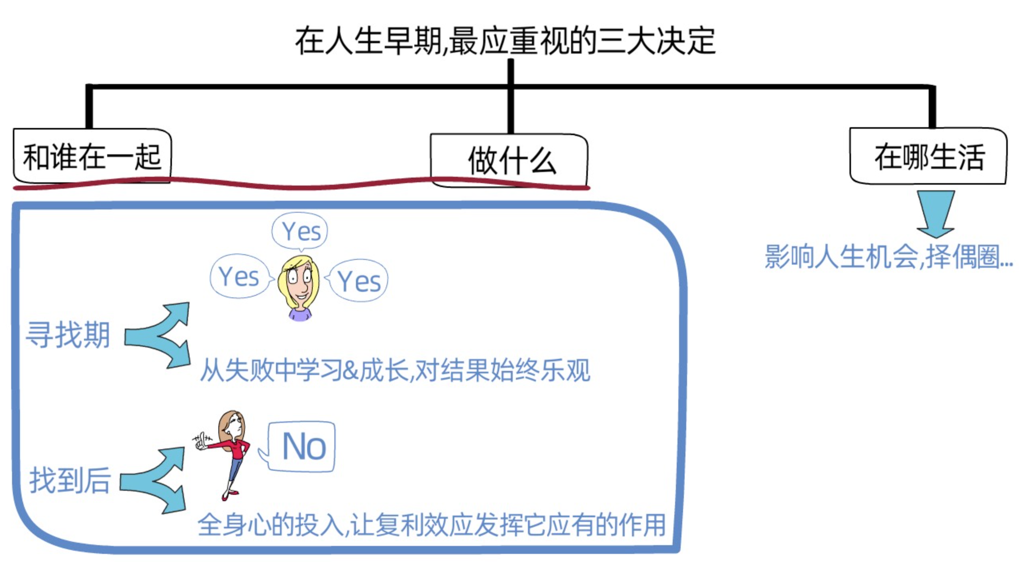 在我们的人生早期,naval认为,我们最应该重视三个重大决定,分别是:和谁在一起;做什么;以及在哪生活。
