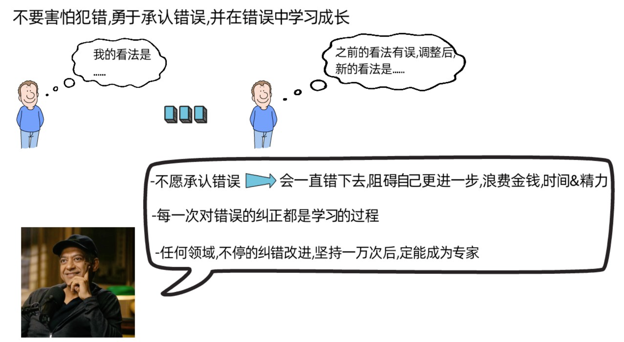 Naval认为,我们在人生中,永远不要害怕犯错,要勇于承认自己的错误,并在错误中学习。就像刚刚提及的一样,我们人随着时间和经历的增加,一直都在改变和成长,以前的想法和决定有可能随着时间的推移,发现是错误的,如果是这样,就勇敢的承认,从错误中学习,持续的精进和改善,成为更好的自己。naval提到,很多有成就的人因为自尊,害怕丢面子,不愿意承认自己曾经的错误,结果就是,会一直错下去,不仅阻碍了自己更近一步,也浪费了自己的金钱,时间和精力。naval表示,每一次对错误的纠正都是学习的过程,在任何一个领域,若能不停纠错改进,坚持一万次后,我们一定能成为这个领域的专家。