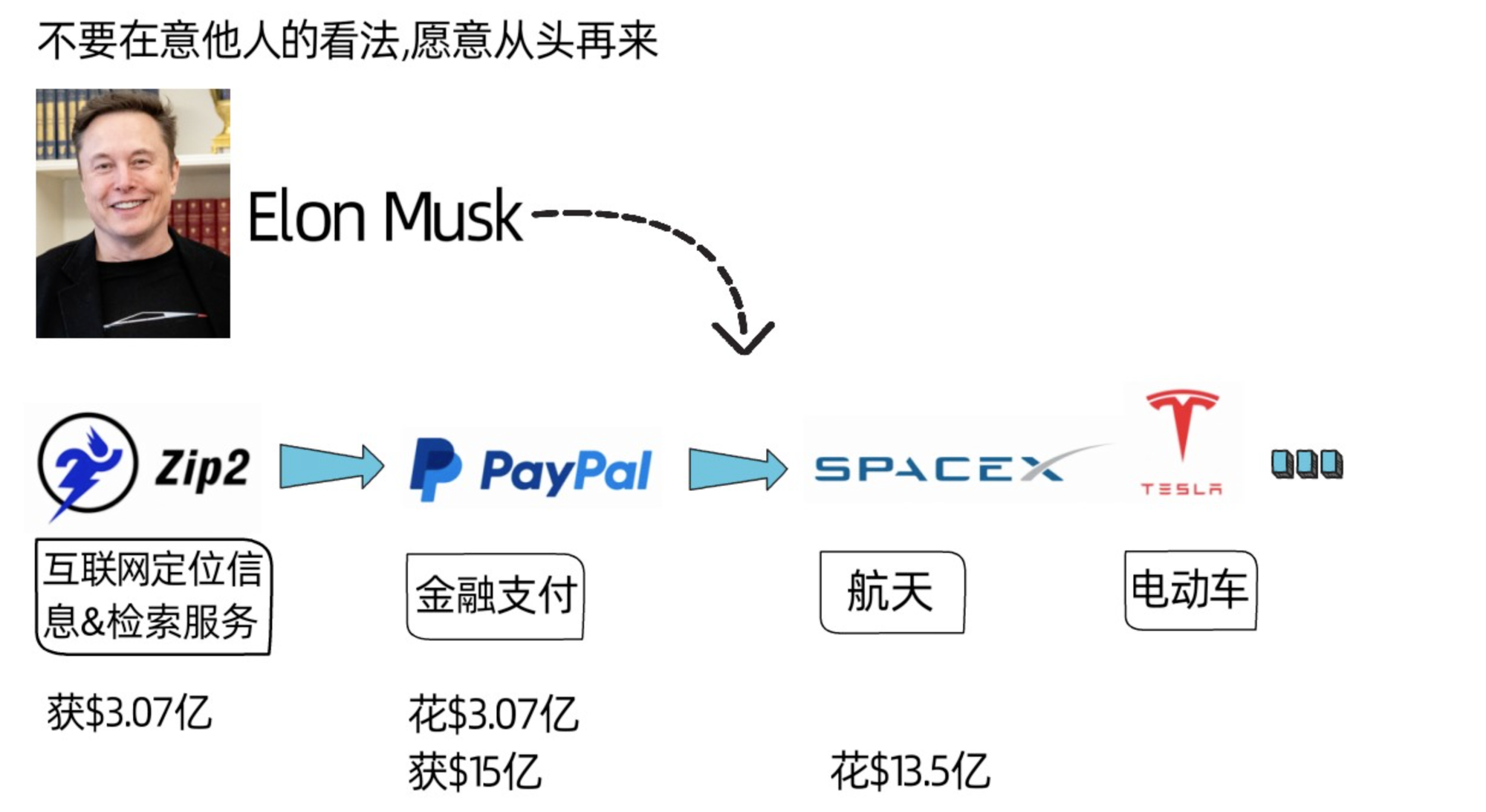 同时,他建议我们要像特斯拉的ceo马斯克学习,他不在意他人的看法,不介意看起来像傻子,不介意从头再来,创造了一个又一个事业,比如,他在1995年创立了为企业提供在线黄页和地图服务的zip2公司(互联网定位信息和检索服务),以3.07亿美金卖掉zip2公司后,从零开始,进军金融支付领域,将3.07亿美金全部投入新成立的在线支付公司x.com;x.com(后更名为paypal)以15亿美金被ebay收购后,马斯克再次从零开始,进军航天和电动汽车领域,将所得资金的90%投入两家新成立的公司,space x和特斯拉……