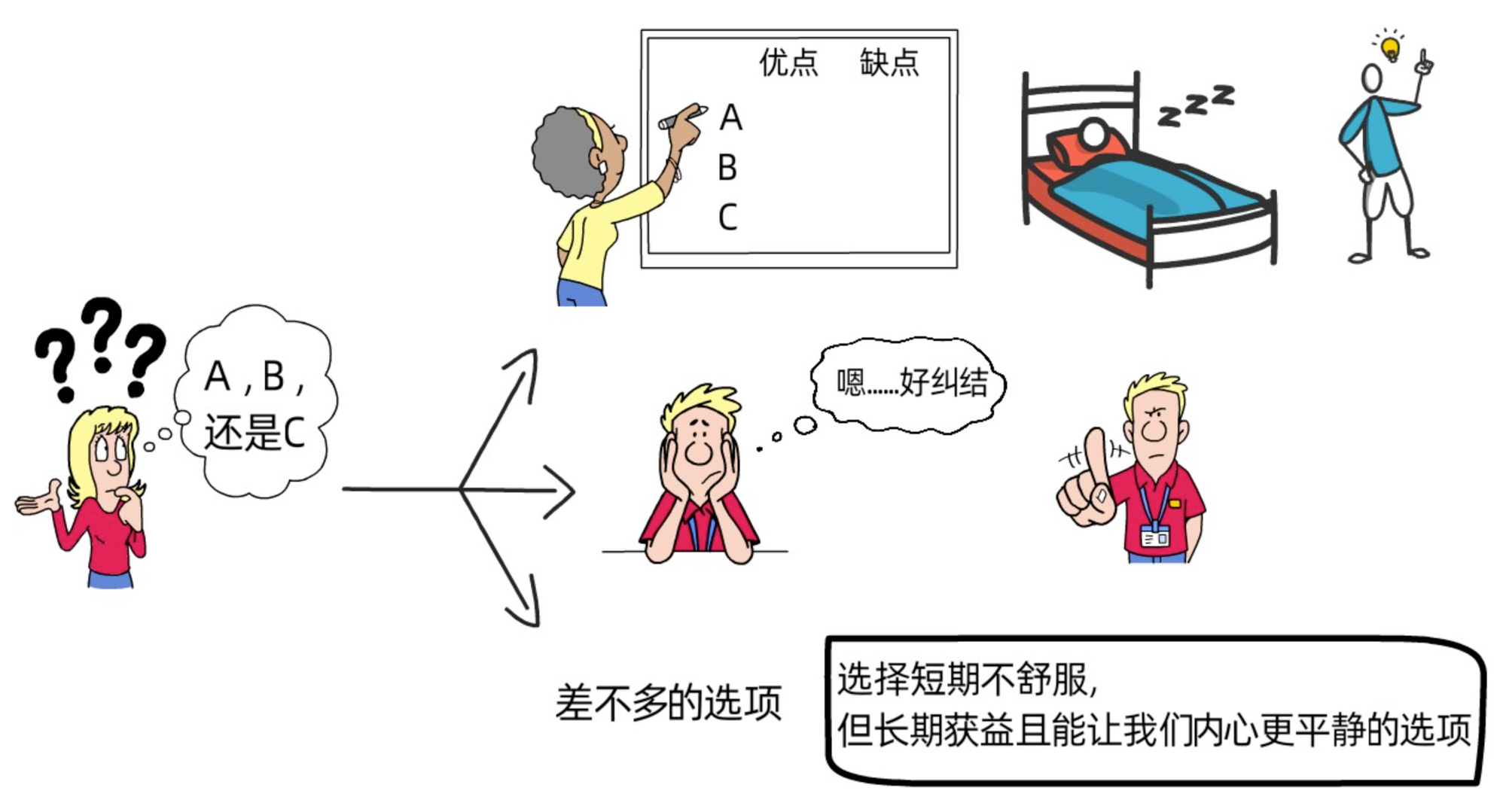 当我们在面临很多选择,无从下手时,naval建议,我们可以写下每个选择的好处和坏处,然后去休息,去睡觉,等几天再过来看这些选择,此时可能会有更加清晰的思路;如果我们面对选择无法抉择时,那么答案就是“不”;如果我们面前的选择都差不多,naval建议我们选择那个短期不舒服,但能让我们在长期中获益且内心更平静的选项。