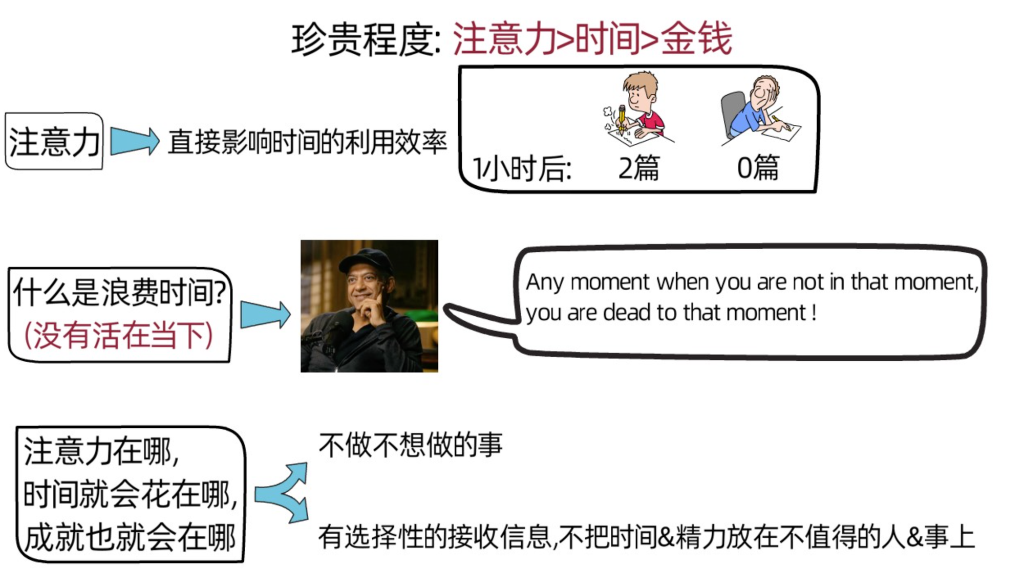 (3)除了慎重作出选择外,naval建议我们要重视和珍惜自己的注意力和时间(注意力>时间>金钱)