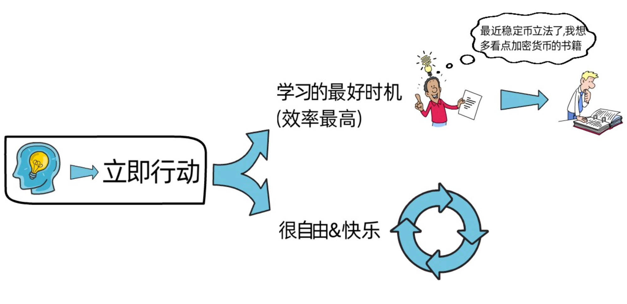 因为灵感是稍纵即逝的,现在想做并不代表永远想做,而且naval表示,有了灵感就立即行动,也会是我们学习的最佳时机,因为有灵感意味着我们有意愿去做某件事,如果我们立即去做,那我们会觉得有趣且开心,会真心沉浸其中,此时也会是我们效率最高的时候,所以,有了想法就要立即行动,比如,最近稳定币开始立法了,我们想看关于加密货币的书籍,那就立即去阅读。