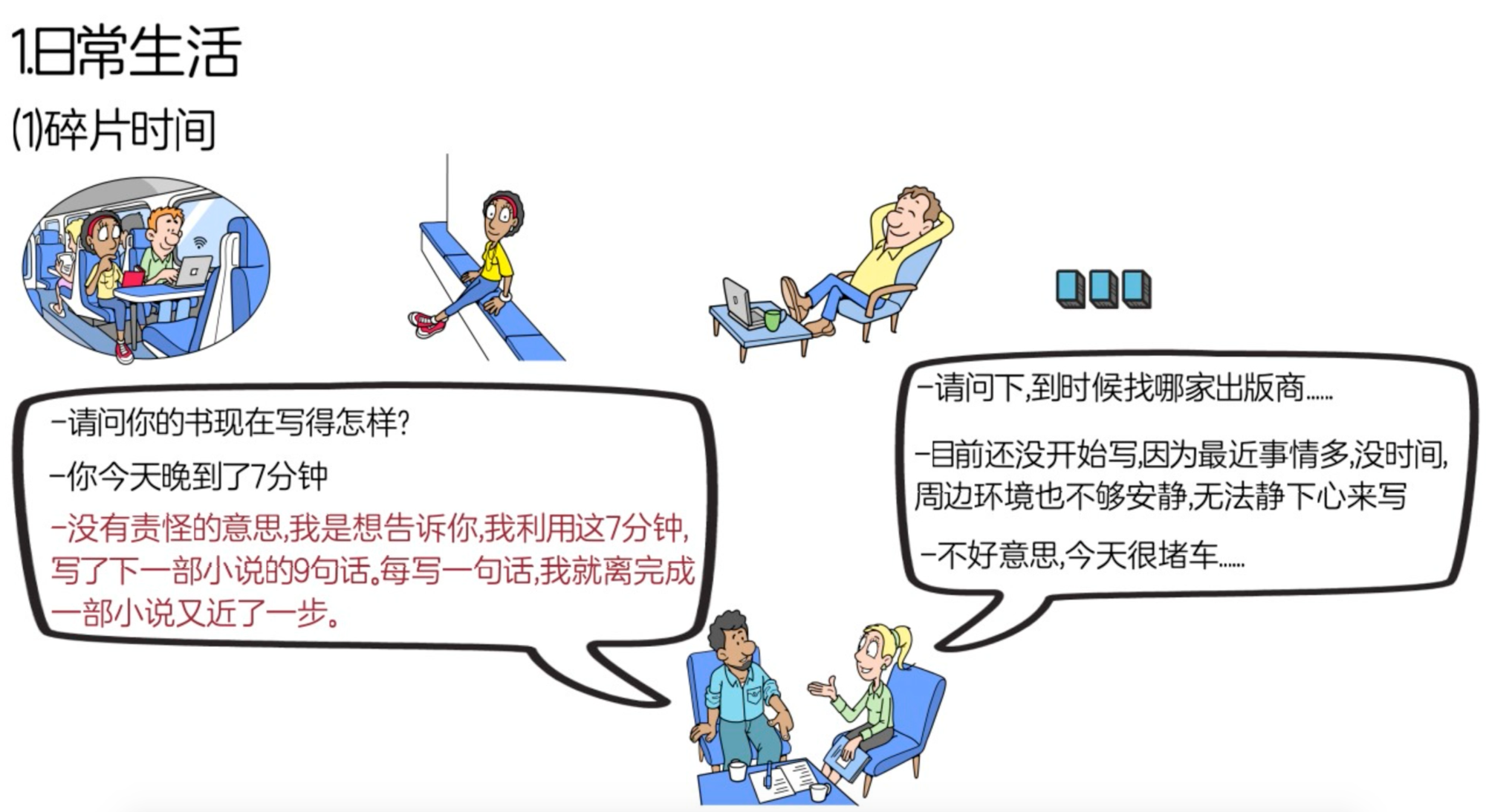 在日常生活方面,作者表示,我们可以利用碎片时间去做想做的事,比如,可以在通勤,等候他人,或者中午午休等碎片时间去做我们想做的事。作者有位朋友曾经约他见面,想咨询关于如何成为作家的问题,他们见面后,对方一直在咨询关于书的出版问题,作者问对方书写的怎么样,对方表示由于没有足够的时间和安静的环境,目前还未开始创作,作者听后说到“你今天晚到了7分钟”,对方连忙道歉,作者继续说道“这不是我想表达的意思,我想告诉你,我利用你晚到的7分钟,写了我下一本小说的9句话,一本小说大概由5000句到10000句话组成,每写完一句话,就让我更靠近完成一本小说的目标,今天等你的7分钟让我们离完成一部小说又近了9句话。”