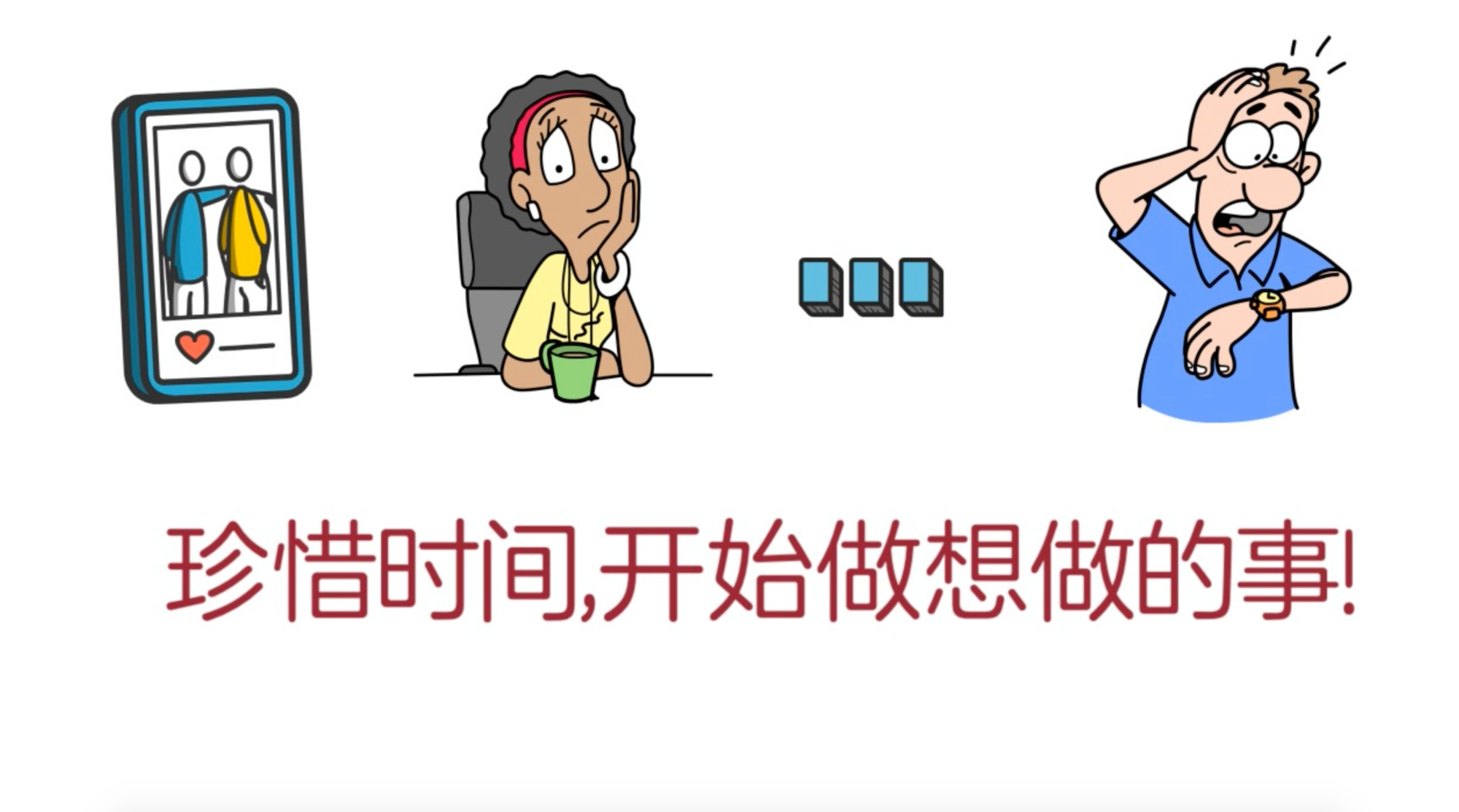 时间是永远不会等我们的,在我们玩手机,玩社交媒体,犹豫不决,总是想等一等再做想做的事时,时间就在悄然地流逝着,希望各位把握当下,好好珍惜时间,开始着手做自己想做的事,让自己拥有精彩且不悔的人生。