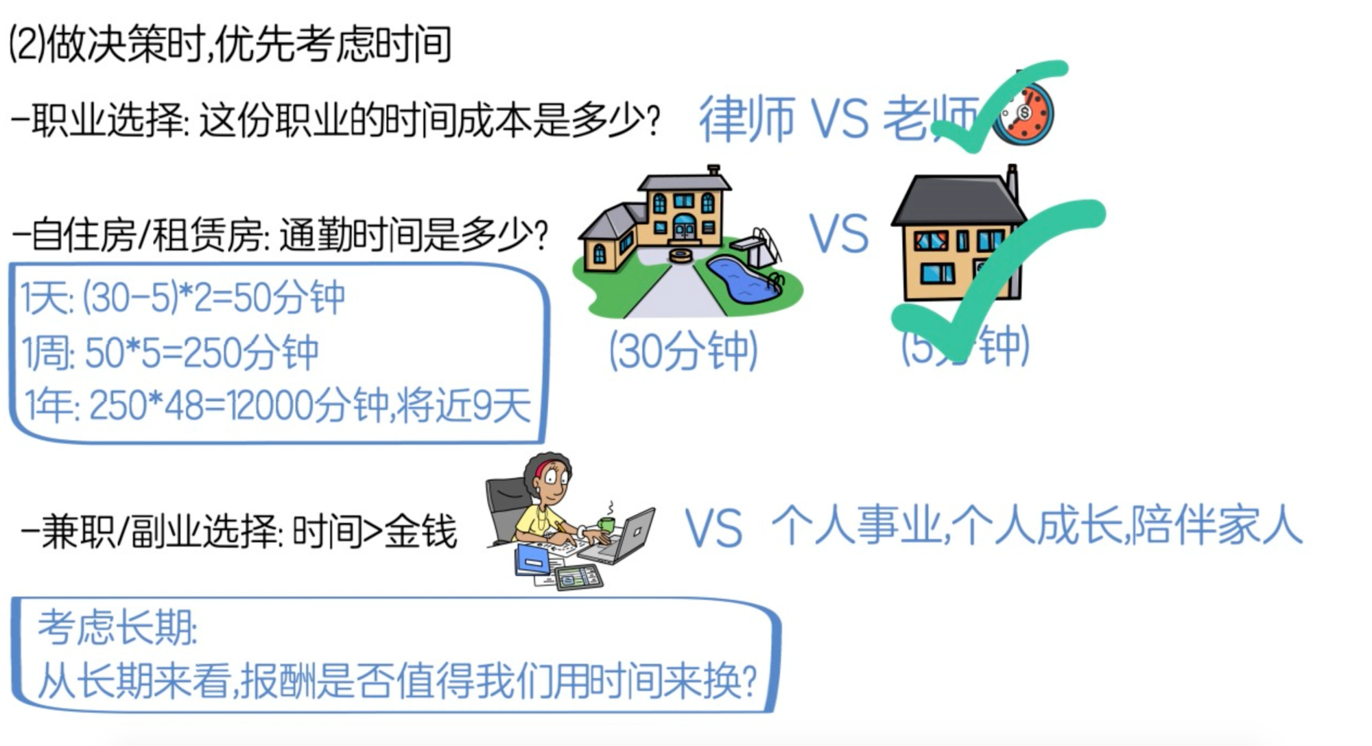 -比如,当我们在思考是否做兼职或副业,以及做什么时,在考虑收入的同时,也要把时间成本考虑进来,要始终记住时间比金钱有价值,眼光不要局限在眼前的兼职或者副业所带来的微薄收入,要从长远的眼光来看这份副业所带来的报酬是否值得我们用时间去换,要把时间用来做那些长期对我们有利的事,比如创建个人事业,学习技能和知识,或者陪伴家人等。