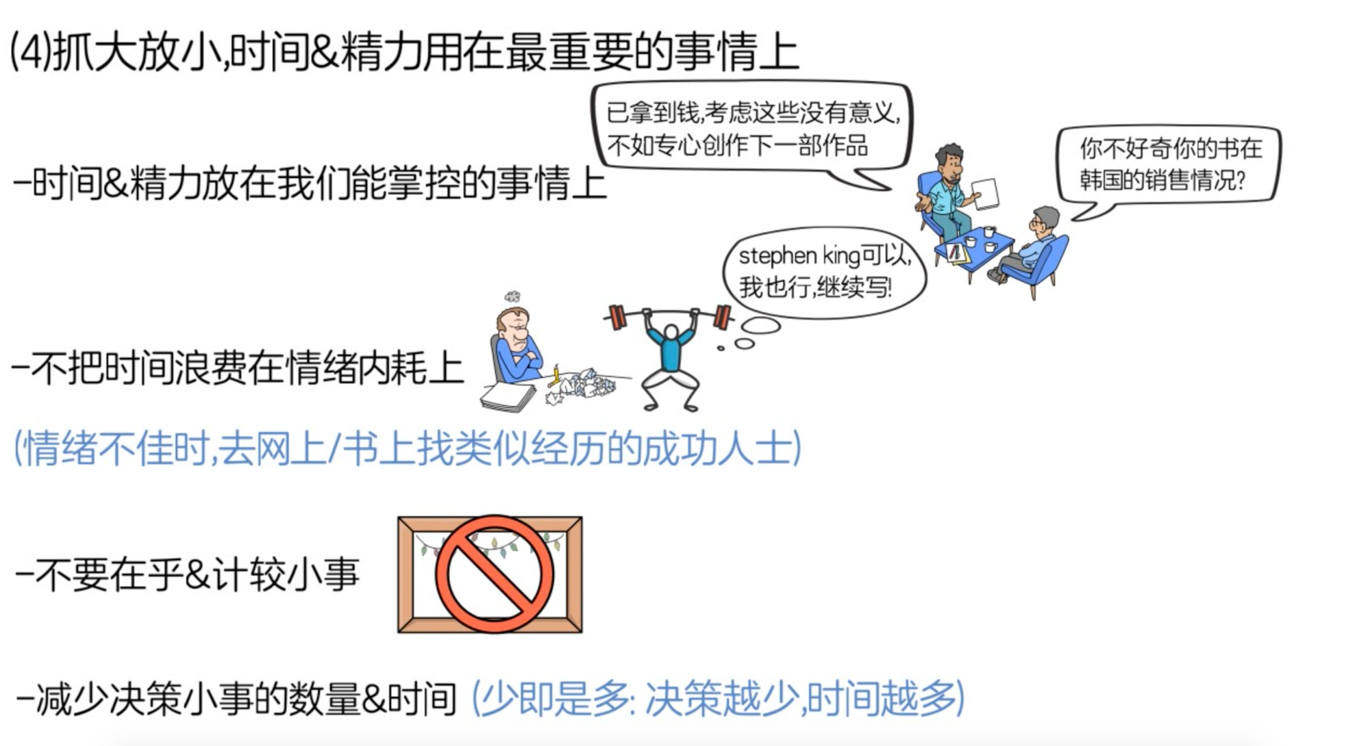 -比如,把时间和精力放在我们能掌控的事情上。曾经有一天,作者收到韩国出版商寄来的支票,当时他岳父问他,“你就不好奇你在韩国卖了多少本书么”,作者表示,“一点都不,我已经拿到了支票,了解卖了多少本书也无法改变支票金额”,他岳父听后对他表示无语,但他认为,书已销售,支票也已拿到,再花时间去想书的销售情况没有任何意义,因为就算花时间去了解了,也不能改变,还不如把这个时间投入到下一本书的创作里面,因为写书是自己能掌控的事。