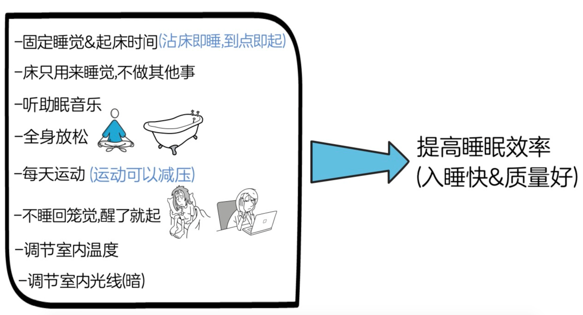 作者认为,床的目的就是为了睡觉,而不是为了在床上玩手机,看书之类的,有效的睡眠是躺上床就开始进入睡眠,也就是说减少在床上做其他不是睡眠的事。对此,他提出了以下8点建议: