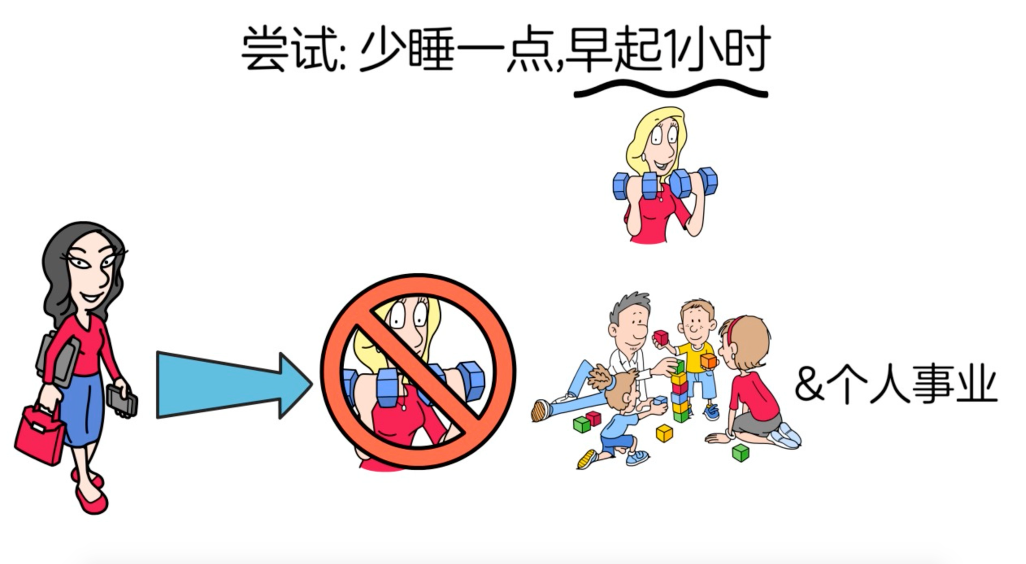 如果我们依然觉得没有时间做自己想做的事情,作者表示,我们可以尝试少睡一点,比平常早起一个小时,用这早起的一个小时去做自己想做的事,比如,健身,冥想,阅读,或者做自媒体之类的。如果觉得感觉良好就继续坚持下去,如果觉得不行,还是要把觉睡够,那就恢复到原来的起床时间。作者的朋友Erica,是一位crossfit的热爱者,选择听取作者的建议,尝试每天少睡点,比原定时间早起1小时,并利用这一个小时来运动,这让她下班后不用再急匆匆的去健身房,多了1小时来陪伴家人,做自己想做的事,她开始利用每天多出来的一个小时,来做自己的个人私教事业,帮助他人管理自己的饮食,运动和精神健康。她发现,她尝试少睡的这一小时,不仅让自己收入来源多了,精神世界也更加满足了,日常生活还更加精神抖擞了,她觉得很值!