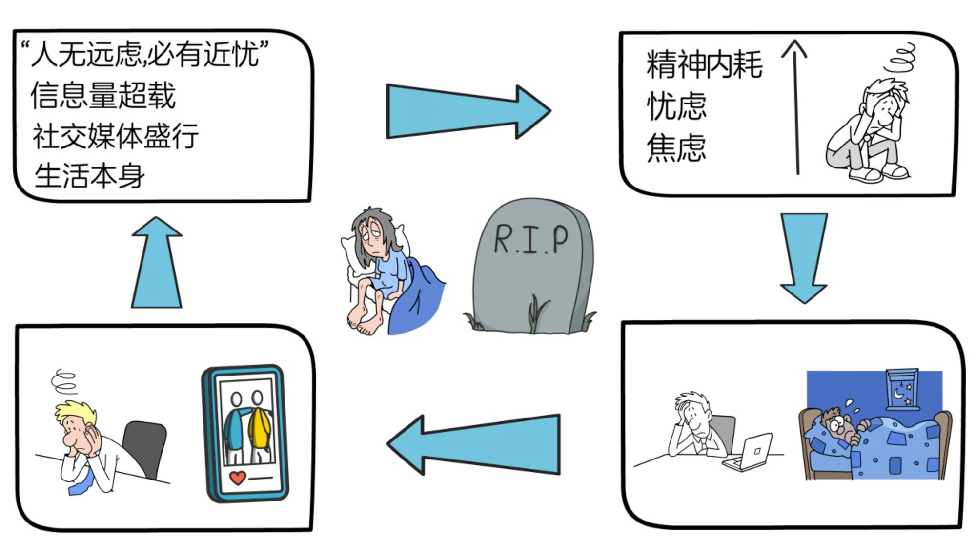 古话说“人无远虑,必有近忧”,如果没有长远的考虑,忧患马上就会到来。但有时,想得远且想得多,反而容易让自己陷入精神内耗,产生忧虑,焦虑等不良情绪;而且,因为现在我们身处信息化社会,信息量的超载和社交媒体的盛行,大量媒体及个人以负面新闻,光鲜亮丽的内容等来博眼球,进一步加深了我们的这些不良情绪;此外,每个人不论如何富有,都或多或少会面临来自生活的困扰,比如,读书时忧心考试成绩,进入社会后忧心收入,成家后忧心孩子和家庭等。这些忧虑,焦虑等不良情绪,容易使我们白天静不下心来做该做的事,晚上又睡不着觉,此时,很多人会选择继续想更多,或者通过刷手机来排解,结果就进入了不良情绪的恶性循环中,导致自己精神状态越来越差,生活的越来越不开心,不幸福。