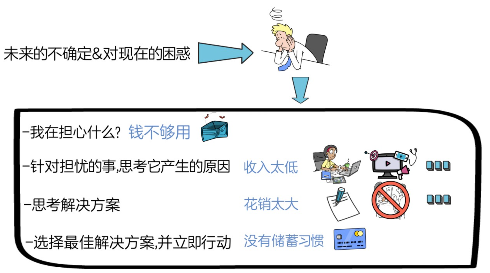 (1)首先,问自己一个问题,“如果我不能解决现在面临的问题,最坏的结果是什么?”,这一步主要是为了帮助我们理清思路,明确最坏结果。