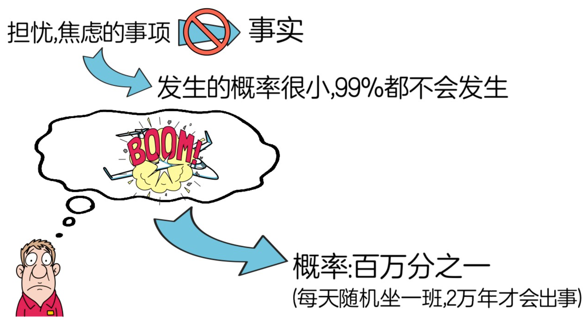 作者卡耐基表示,我们面临的所有忧虑,焦虑,内耗等情绪,都是我们自己想象出来的,并非现实。而且,当我们自己去查询我们担忧的事情发生的概率时,会发现,99%的事情都不会发生。所以,当我们开始忧虑时,可以去查看过去的记录,并问问自己,我现在担心会发生的事,它可能发生的概率究竟有多大?我们担心的事情真的会发生么?比如,有些人害怕坐飞机,担心发生空难,但实际上,飞机失事的概率极低,约为百万分之一,若一个人每天随机乘坐一次航班,平均需要约2万年才能遭遇一次致命事故。