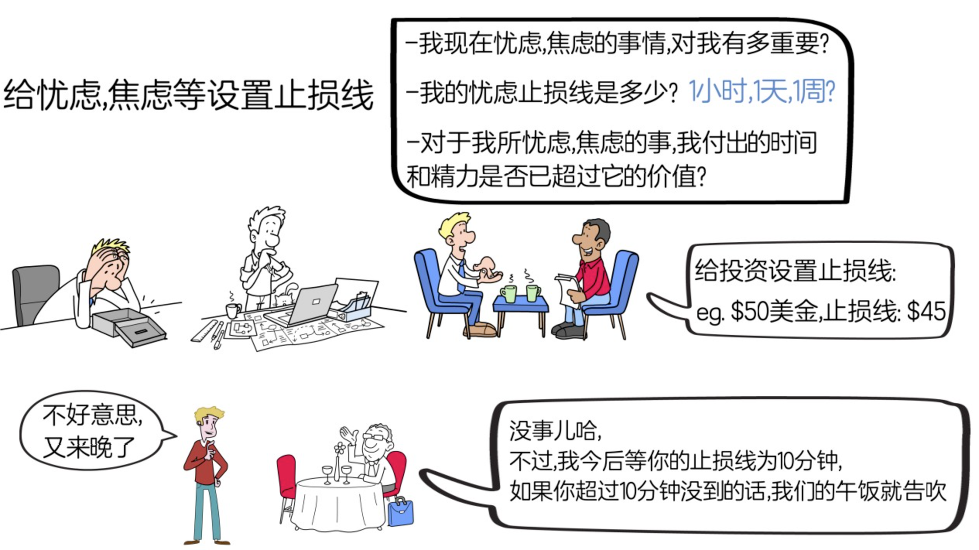 作者听了罗伯特的这个经历后,也开始将止损这件事,应用在日常生活中,比如,他和一个朋友定期相约共进午餐,但朋友很少准时赴约,总是姗姗来迟,这也导致双方因为吃饭迟到这件事争吵多次。于是,作者告诉朋友:“亲爱的,在等你这件事上,我的止损线是十分钟,如果你迟到十分钟以上,我们的午餐就告吹,我也不会再等你了。”自此,朋友很少迟到,就算迟到了,作者也没有再浪费时间和精力再等待朋友,双方也没有再因为吃午饭争吵过。