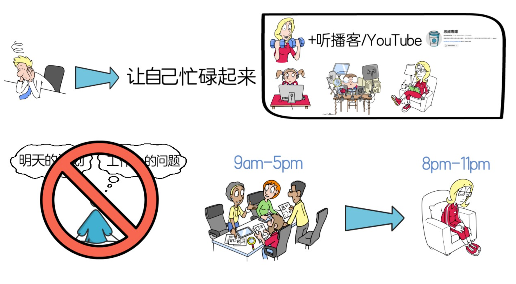 对大部分人来说,白天工作时一般不会有太多思绪,但到家休息时,就很容易开始胡思乱想了。这是因为忧虑或焦虑等不良情绪最伤害我们的时候,不是在我们忙碌时,而是在休息时,所以,消除忧虑的最好方法是,让自己忙起来,但这里的忙不是虚度时间的瞎忙,我们要去忙有意义的事。比如,当我们胡思乱想时,可以去运动,并在运动的时候听一些自我提升或者励志方面的播客或者youtube,以前我觉得这些内容就像心灵鸡汤,没有实际作用,但我现在发现,这些内容对于处于低落情绪的人有很大的激励作用,当我们的情绪被调动起来,精神变得更加积极向上时,我们就会继续认真开始做该做的事,只要坚持的久,就一定会有成效,推荐在情绪不佳时看youtuber“思维咖啡”的视频(链接我放文章下面),每次我低落乱想的时候听他的视频就会感觉好很多,强烈推荐;或者当我们胡思乱想的时候,可以去学一些我们一直想学的技能,或者阅读等,总的来说,就是不要让自己的大脑闲下来,一闲下来,就很容易被不良情绪所困住。