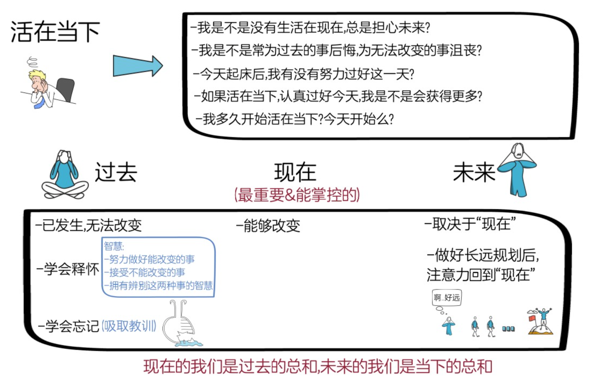 我觉得有句话说得很好,“现在的我们是过去的总和,未来是当下的总和”。过去已无法改变,除了释怀,吸取教训,并忘记外别无他法;但我们的当下却决定着我们的未来,未来虽不确定且未知,但我们能为它做的最好准备是,在做好长远规划后,就将注意力拉回来,专注于当下,认真做好每天该做的事。