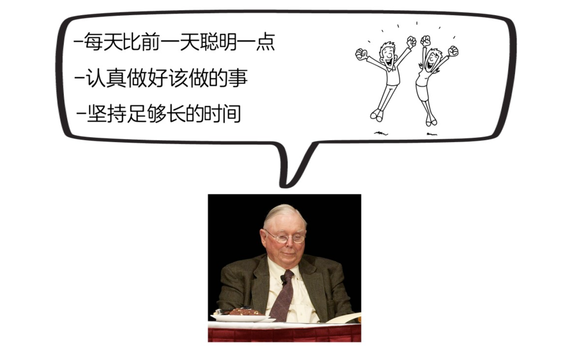 由于最近在看《穷查理宝典》这本书,针对“活在当下”这件事,我想分享下查理芒格的想法,他认为,当我们尝试让自己每天比前一天聪明一点,认真做好该做的事,并坚持足够长的时间,我们将获得我们应得的结果。所以,不要去悔恨过去,也不要去焦虑未来,做好规划后,认真过好我们的每一天,让自己每一天都在成长,日积月累,通过复利效应的神奇魔力,我们会活成我们想成为的人!