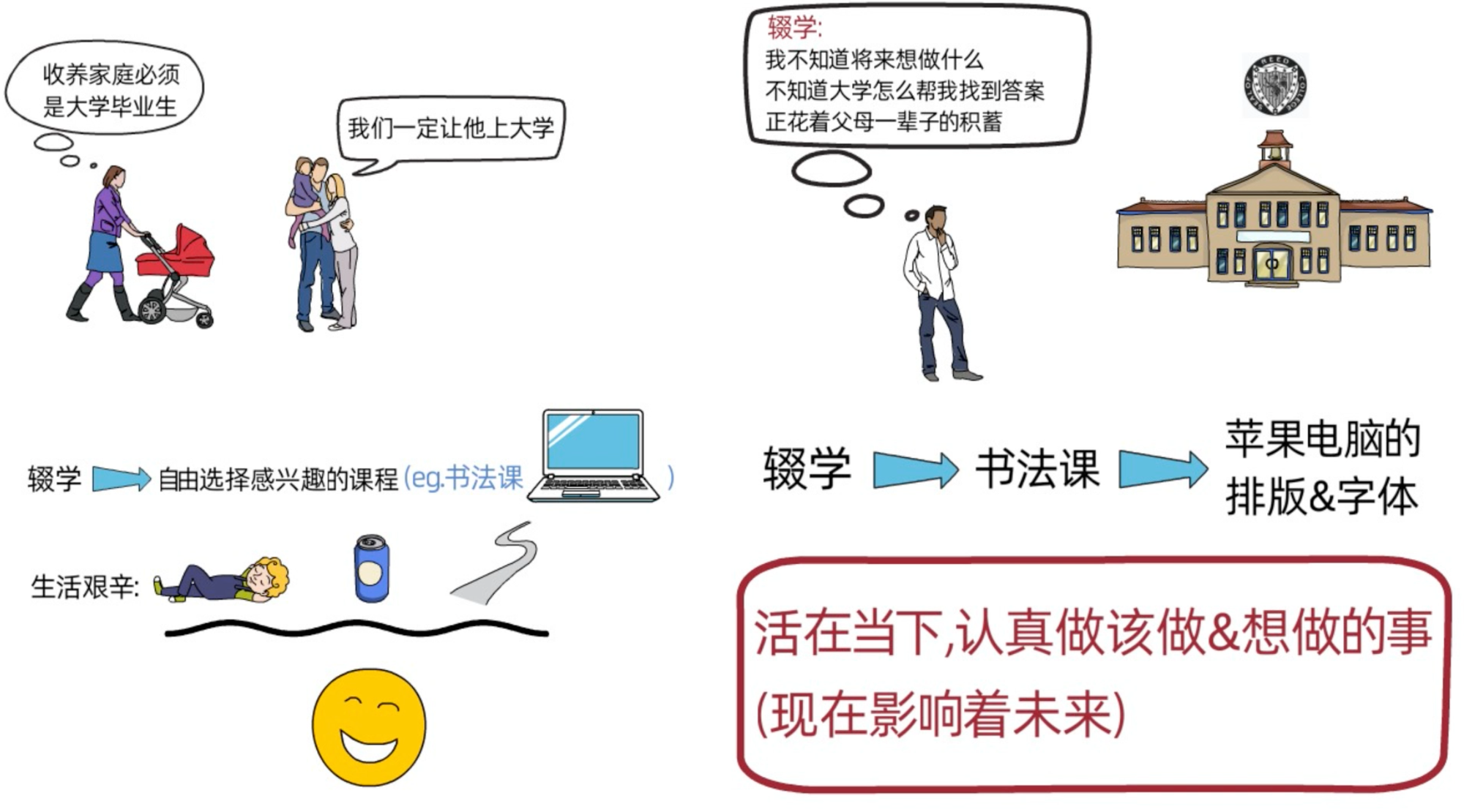 也正因为这个决定,他可以自由选择自己真正感兴趣的课程。虽然生活非常艰难:他因没有宿舍,只能睡在朋友宿舍的地板上;没钱吃饭,就去捡可乐瓶换零钱;每个周日,他还要走7公里去教会,只为了吃一顿免费的晚餐,尽管如此,但他感觉快乐且充实。而且也由于他跟随自己的喜好,这些经历最终都变成了宝贵的财富。比如,他旁听的书法课,当时看似毫无用处,但十年后,书法课里的这些知识直接影响了苹果电脑的排版和字体设计,后来整个电脑行业,包括微软的 Windows系统,也都借鉴了这种设计。