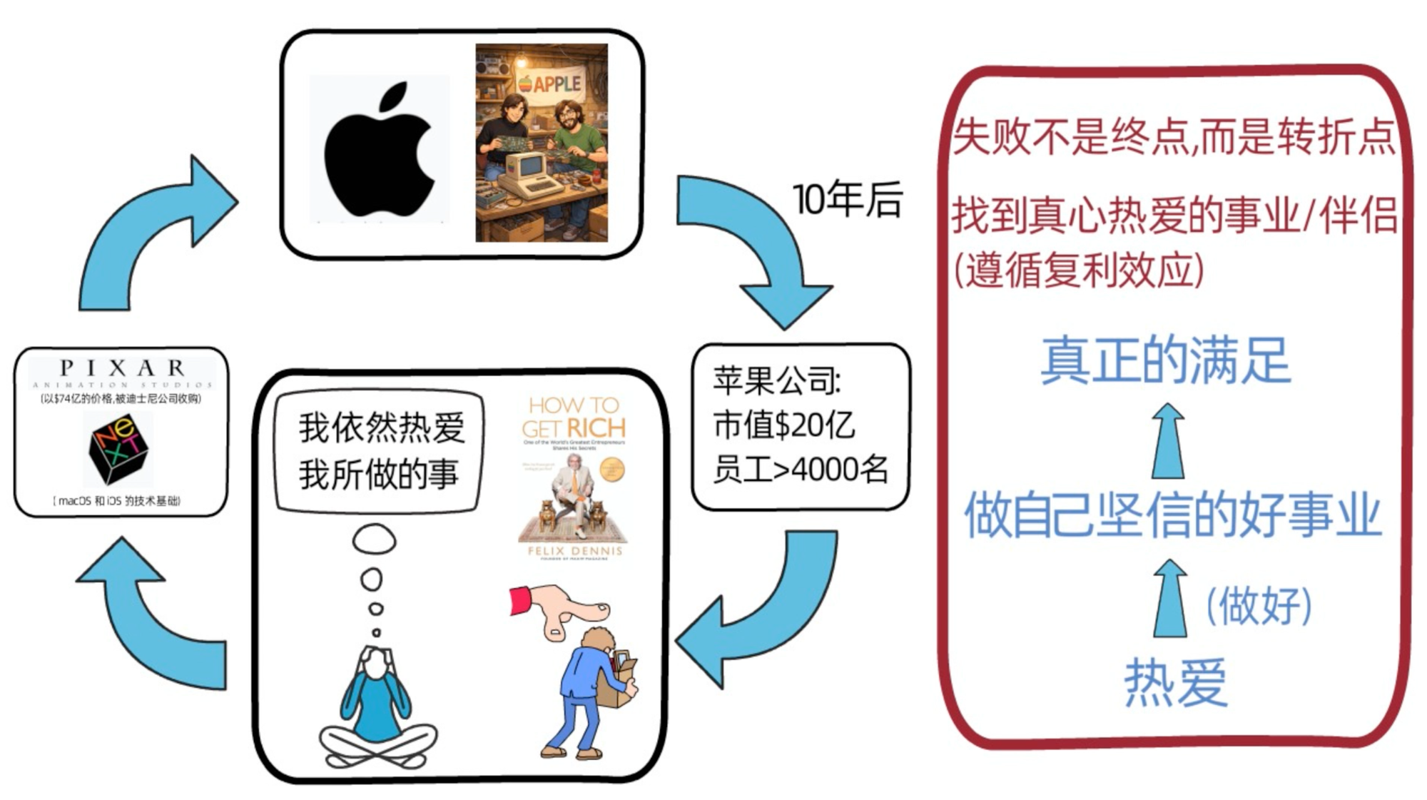 虽然被解雇了,十分沮丧,但史蒂夫乔布斯发现,自己依然十分热爱自己之前做的事,所以,他决定从头再来,陆续创建了两家公司,分别是pixar和NeXT。pixar成为了世界顶级动画工作室之一,并于2006年以74亿美金的价格,被迪士尼公司收购;NeXT被苹果公司收购, 它的计算机操作系统也成为了后来 macOS 和 iOS 的技术基础。史蒂夫乔布斯也因这两家公司的优秀,最终重返苹果。