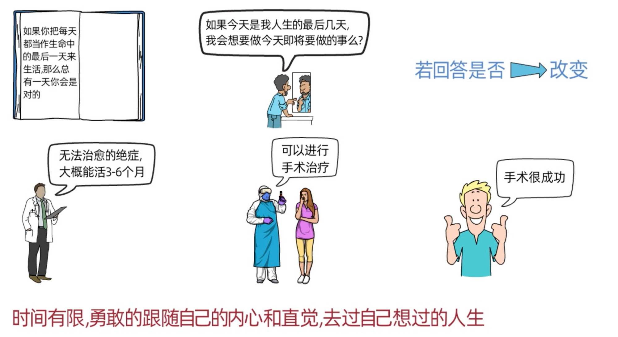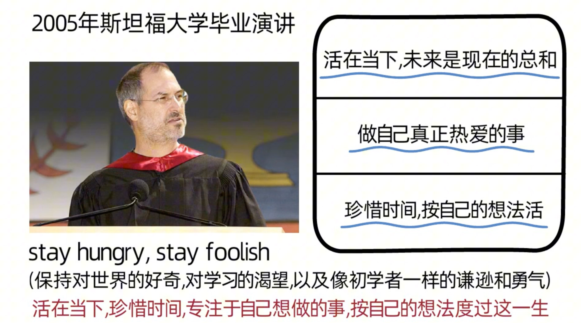 史蒂夫乔布斯在2004年时被诊断出,得了无法治愈的绝症,只能活3-6个月。后来,做检查时,医生发现可以做手术治疗,最终治愈成功。这次的经历是他离死亡最近的一次。也正因为这次的经历,让他体会到死亡随时都会到来,我们的时间其实非常有限。所以,他建议我们,不要活在别人的期待里,不要被他人/社会的想法所左右,要勇敢的跟随自己的内心和直觉,去过自己想过的人生。因为我们的内心深处是知道我们真正想要什么。