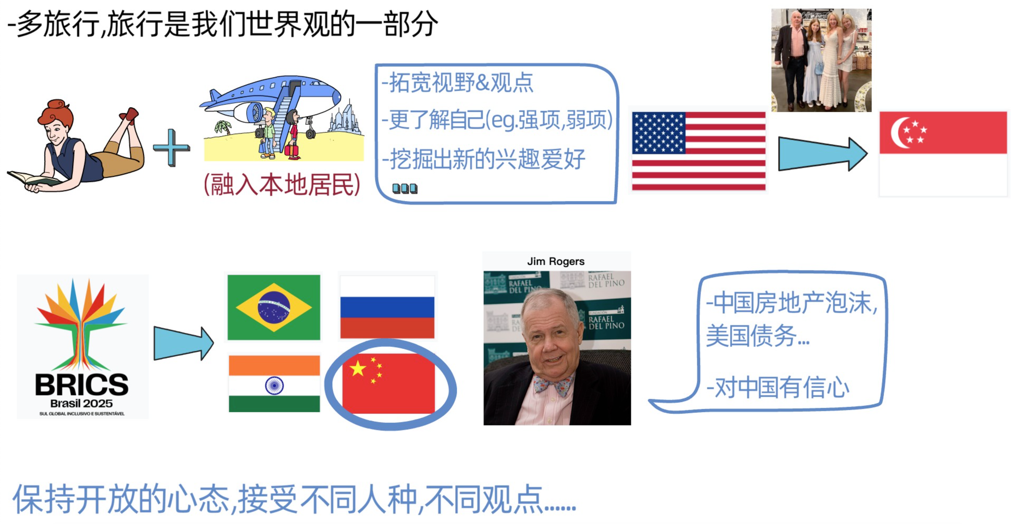 他同时也建议我们要保持开放的心态,欣然接受世界中不同的人种。吉姆罗杰斯是1942年出生的,在他们那个年代人种歧视较为普遍,他能有这样的感悟和建议,我觉得和他的两次环球旅行是分不开的。