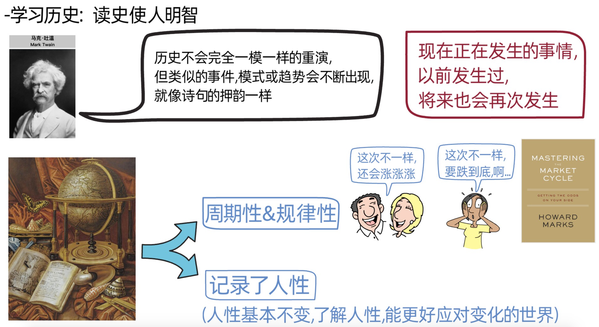 比如,股市大涨时,投资者总是容易乐观,总是觉得“这次行情不一样,会持续上涨”,或者股市大跌时,投资者总是容易恐慌,总是觉得“这次崩盘不一样,会跌到底”,但该来的总是会来,市场走势总是遵循历史走势的规律。刚刚提到的霍华德马克斯也提过历史趋势会重演,所以他写了本叫做《周期》(《mastering the market cycle》)的书,里面就分析了市场变化的规律,以及如何在各个阶段进行投资的实践指南。今年有空的时候,会把这本书分享给各位。