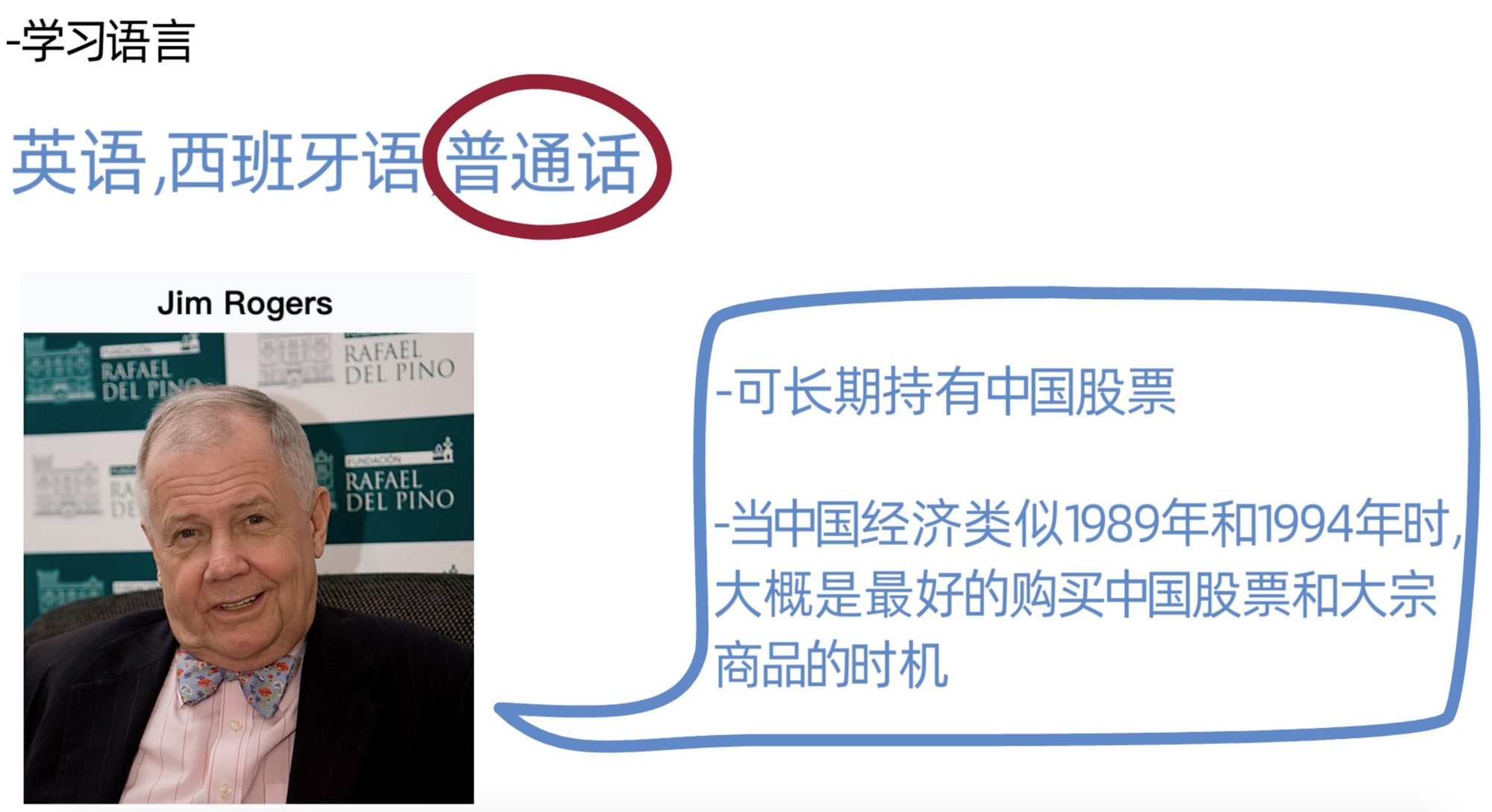 吉姆罗杰斯建议要学习语言,世界上三大普及语言为英语,西班牙语和普通话。他本人十分看好中国,认为21世纪是中国的世纪,普通话会像英语一样普及,所以,他让两个00后女儿从小学习普通话,两位都能说一口纯正流利的普通话。