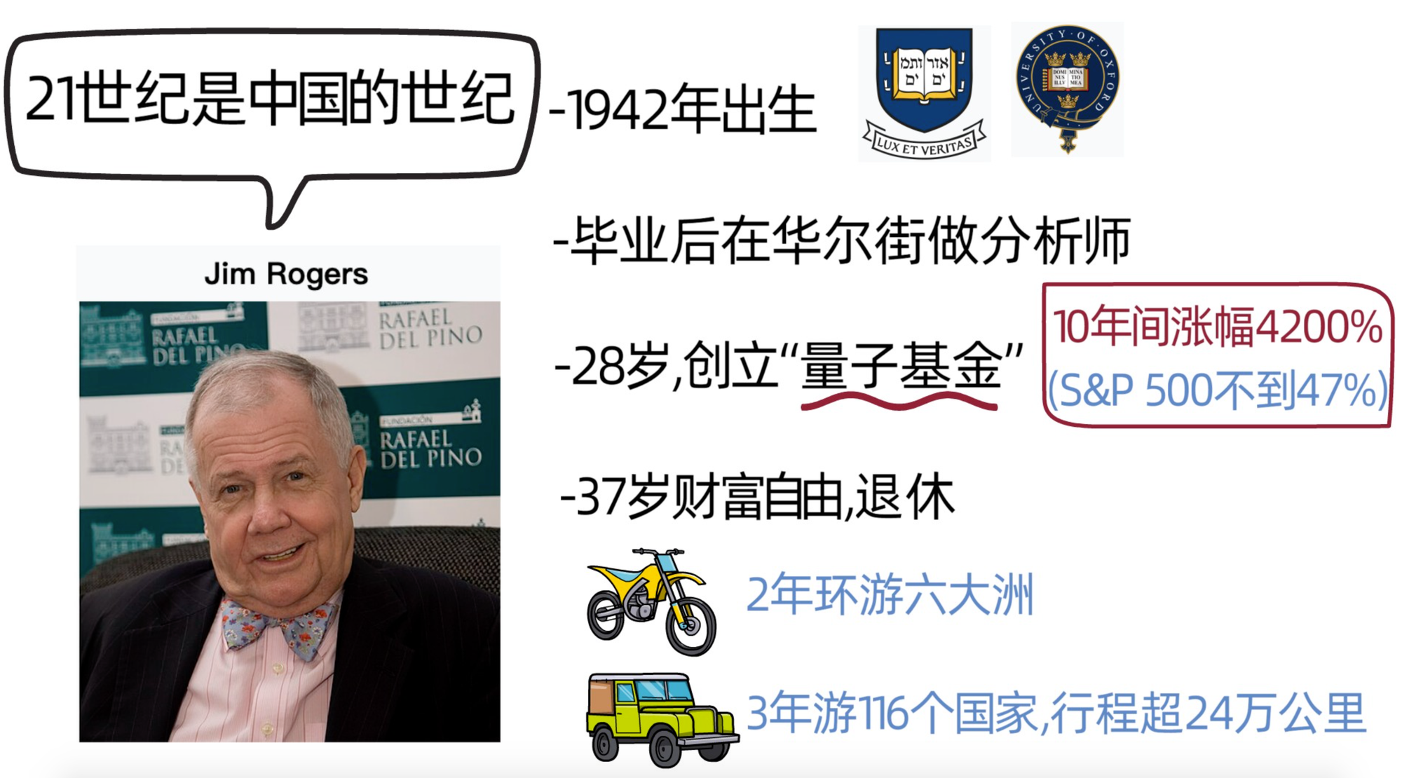 吉姆罗杰斯是个地道的学霸,1942年出生在美国,在耶鲁大学学完历史后,去牛津大学学哲学,毕业后在华尔街做分析师,28岁与金融大鳄乔治索罗斯共同创立了“量子基金”,1970年-1980年间,量子基金表现十分出色,10年间增长4200%,也就是涨了42倍,同期标普500指数的涨幅不到47%,这让他声名大噪,然后,37岁的他在实现财富自由后,选择退休去周游世界。1990年-1992年,两年间,骑摩托车环游六大洲,1999年-2002年,三年间,开汽车环球旅行,行程超24万公里,到访了116个国家。