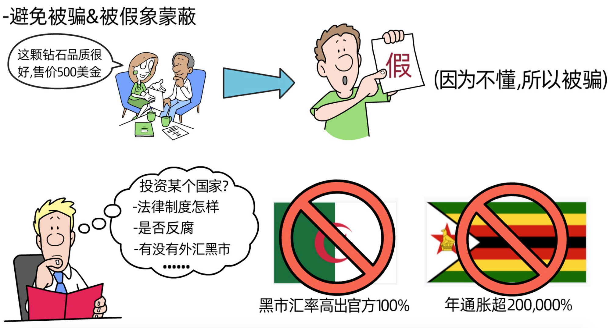 了解事物全貌不仅不会让我们被骗,也不会让我们被假象蒙蔽。比如,当我们在决定是否投资一个国家时,不能简单的仅凭阅读杂志和新闻上面的内容就进行判断,而必须要亲自去这个国家看一看,检查这个国家基础机构的强弱程度,也就是指这个国家的法律制度怎么样?是否尊重法治?是否反腐败?法律体系是否有助于推动企业的道德行为等?我们可以实地调研,看这个国家是否有外汇黑市,如果有,这个国家就有一定的问题。因为只有当政府有人为的强制措施时,外汇黑市才会存在。官方汇率和黑市汇率的差值反映了这个国家问题的严重性,差值越大,问题越严重。