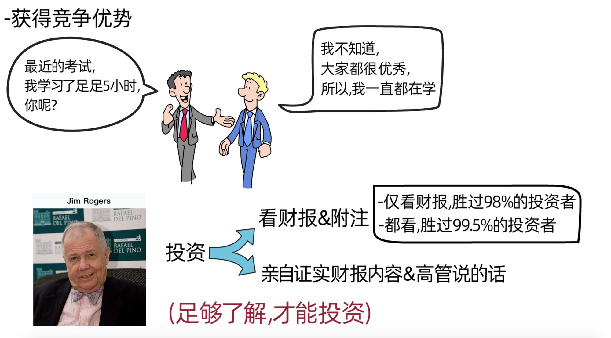 比如,针对投资这件事,吉姆罗杰斯认为,我们需要仔细看完对应公司的所有财务报表,包括里面的附注。如果仅看公司财报,我们就可以比98%的投资者准备得更充分;如果我们还看了财报里面的附注,我们就会比99.5%的投资者准备得更充分。在吉姆罗杰斯看来,想要做好投资决策,不仅要看财报,还要亲自去证实财报里的内容以及公司高层所说的话,通过和消费者,供货商,竞争者,或者任何会影响公司经营的人或机构进行沟通交流的方式去证实。他认为,只有当我们能100%保证,我们对这家公司的了解程度胜过98%的华尔街分析师时,我们才投资,否则千万不要投资。