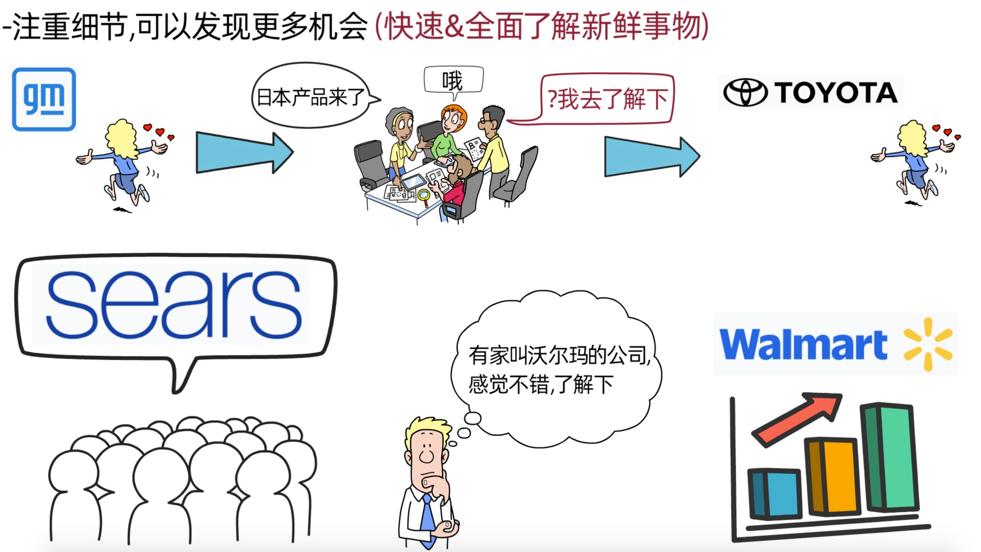 比如,在60年代时,美国通用汽车是世界上最成功的公司,所有人都想拥有它家的股票。有一天,有位通用汽车的分析师表示,“日本产品来了”,当时大部分投资者都选择忽视他说的话,然而有些投资者却留意了他的话,去做了大量调查研究,并选择卖掉高价的通用汽车股票,买入日本丰田。结果,日本的丰田汽车迅速席卷全球汽车市场,购买日本丰田的这些投资者大赚了一笔。