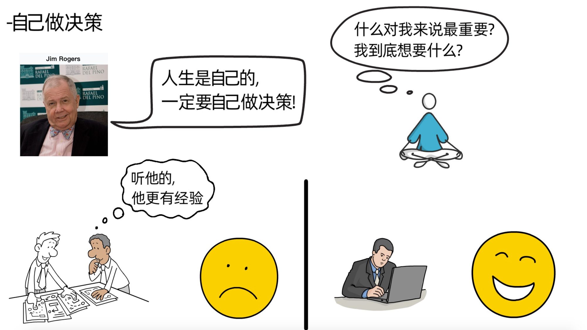 吉姆罗杰斯表示,我们的人生是我们自己的,一定要自己做决定,比如,“什么对于我们来说是重要的”“我们到底想要什么”,这些都是很重要且需要我们自己决定的事。他人的建议,有时有用,有时无用,鉴别他人建议对我们是否有用的方式和我们做决策一样,依然是全面获取一切能获取的信息,然后进行独立思考。思考这件事,不能依赖他人,只能自己做。