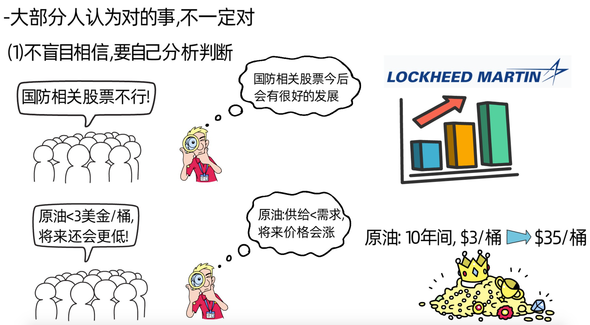 比如,1970年,原油的价格不到每桶3美金,大部分专业人士认为,原油未来的价格将依然这么低。大部分人都认为新技术,以及发现的大型油田,都会让油价保持低位。但仔细调查研究就会发现,原油的供给量远远不足以满足世界对油的需求。因此,吉姆罗杰斯在1971年的时候,投资了大量的原油,10年后,原油涨到了每桶35美金。此时,大家都开始投资原油,但显然,市场已经过热,石油勘探的热潮已过,60年代发现的新油田已开始投产,同时,大部分人开始注重节能,购买节能汽车等,石油需求开始放缓,1978年石油产量第一次超过石油消耗量。于是,吉姆罗杰斯开始卖掉自己手上的石油,直到1998年才开始重新购买。