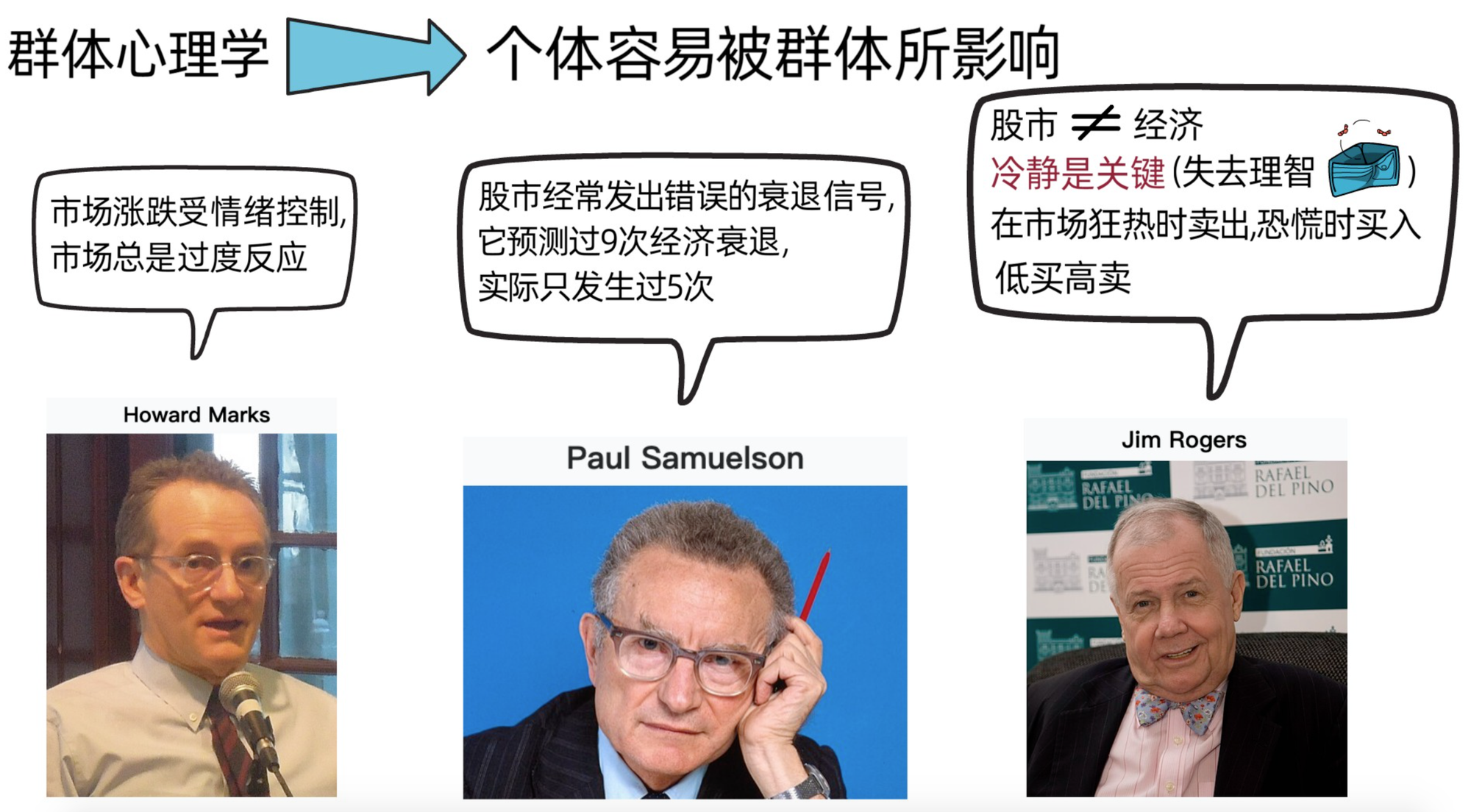 根据相关研究表明,个体容易被群体所影响,理智的人融入大众后,很容易变得不理智。吉姆罗杰斯和之前分享的《投资中最重要的事》这本书的作者霍华德马克斯都一致认为,市场的涨跌经常被情绪所掌控,且市场总是反应过度,美国经济学家保罗·萨缪尔森 就曾说过一句话,“股市经常发出错误的衰退信号,它预测过 9 次经济衰退,但实际上只发生了 5 次”。短期市场价格受情绪影响,中长期还是受基本面的影响。吉姆罗杰斯强调,经济和股市是不同的事,比如,中国的经济一直在增长,但股市在2001年-2005年间却一直下跌。所以,他表示,一定要保持冷静,因为在市场恐慌的时候,如果我们失去了理性和判断,就等于在市场里失去了我们的金钱。
