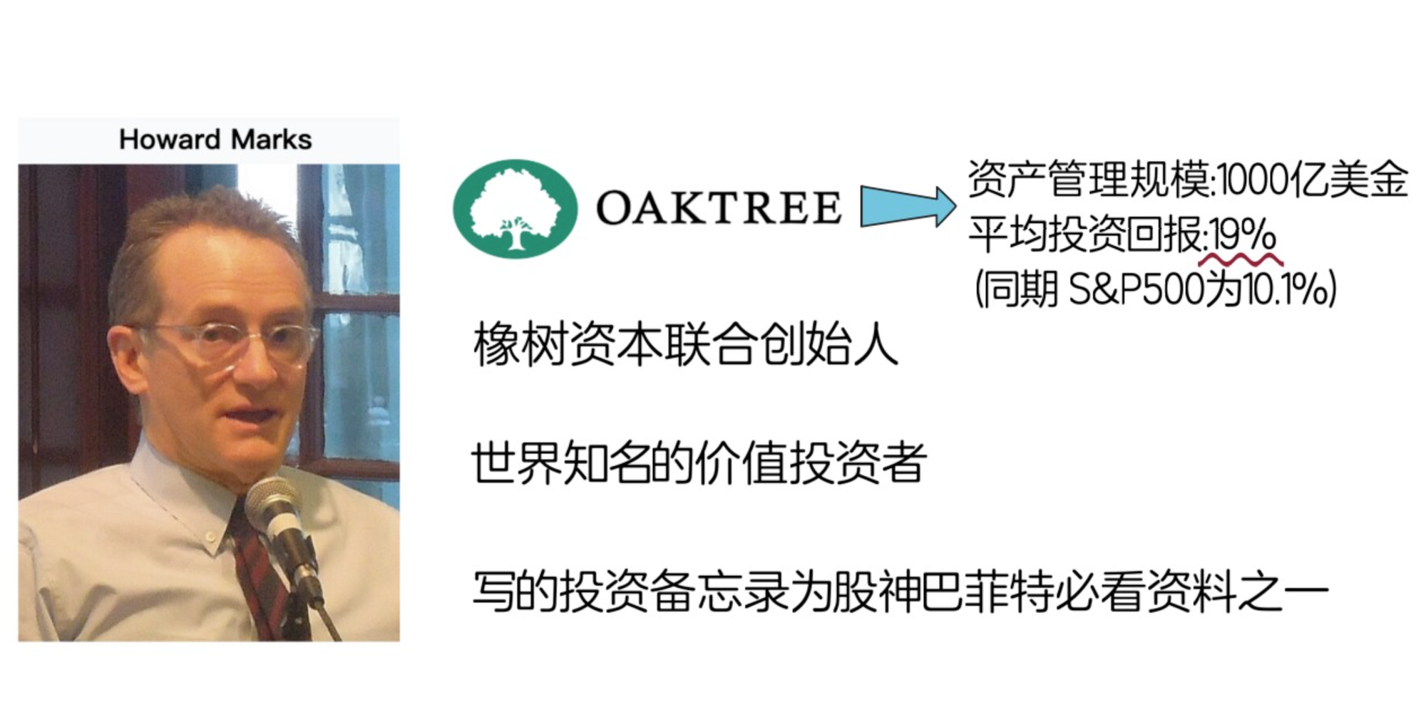 对于不清楚霍华德马克斯的小伙伴,这里先做个简单介绍,他是全球最大的不良资产投资机构,橡树资本的联合创始人,也是世界知名的价值投资者,他写的投资备忘录是股神巴菲特必看的资料之一,本书也是巴菲特强烈建议他写的,可想而知含金量有多高。橡树资本自1995年成立至今,管理的资产已达1000亿美元,20多年来橡树资本的平均回报率高达 19%,同时期S&P500的表现为10.1%。