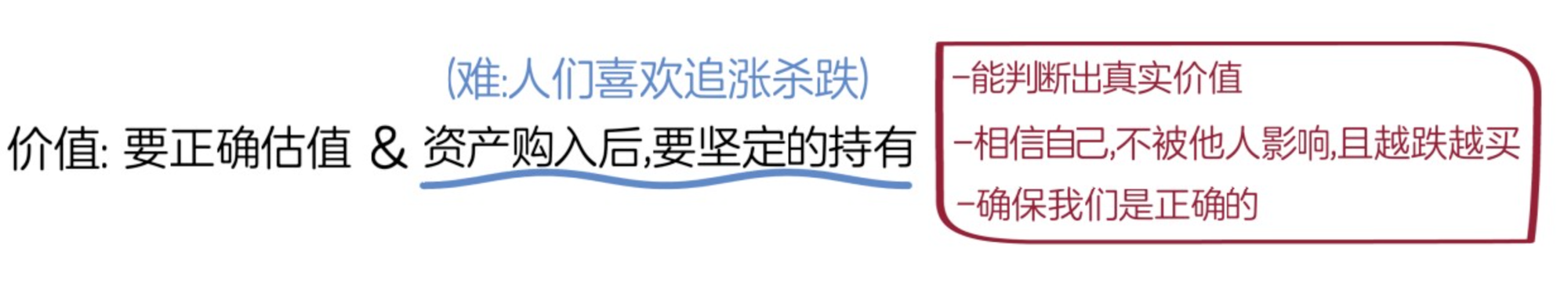 霍华德马克斯认为,当我们开始觉得“股价下跌太多了,我该赶紧抛售了”时,是最关键的时刻,如果我们决定抛售,那最终的成功可能与我们无缘,如果我们决定坚定的持有,那最终的胜利者可能会是我们。因为,价值投资者最大的盈利就是在资产被低估的时候购入,并在市场环境不好的时候,持续购入,降低自己的成本,直到自己对资产的判断被证明是正确的。有句经典的话,“过于超前于时代或市场的发展,其结果与犯错难以区分”,指的是在投资过程中,就算我们对资产的判断是对的,但由于市场里的投资者有理性的,也有不理性的,不理性的投资者可能会影响资产的价格,导致资产价格上下波动,让我们对资产的判断看起来像是错的,但随着时间的推移,资产的价格最终会回调至它的真实价值,所以,只要我们对资产价值的判断是对的,就要耐心等待,始终坚信自己。霍华德马克斯建议,如果想要在下降的市场中坚持持有自己的股票,并最终获得盈利,要重视以下三点: