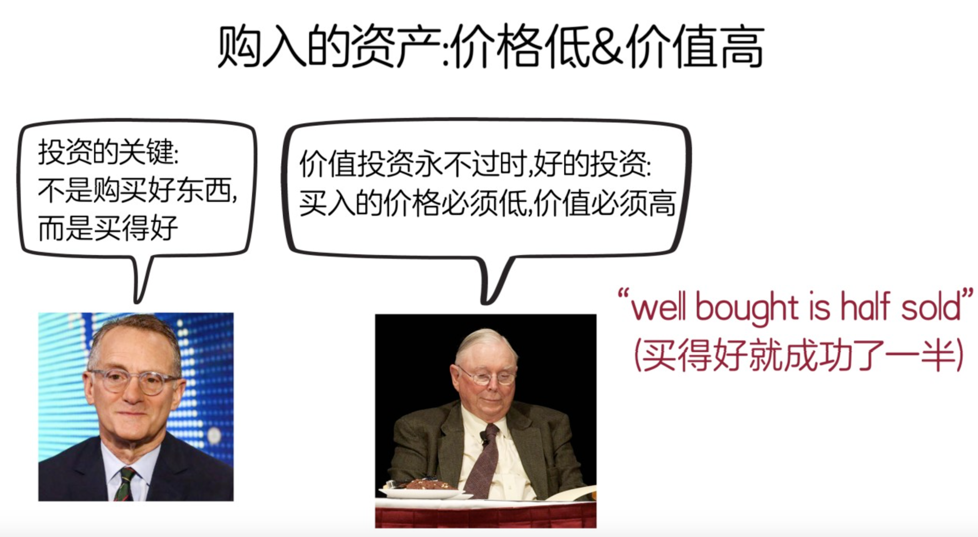 除了要关注资产真实价值外,我们还要关注资产的价格,并对比价值和价格的关系。霍华德马克斯认为,投资成功的关键不是购买好东西,而是买得好。这里的“买得好”指的是,买的资产价格低且价值高。查理芒格曾经说过“价值投资永不过时,以较低的价格,买入较高的价值,是投资的本质,投资想做的好,买入的价格必须低,价值必须高”,垃圾只要够便宜,也是能赚到钱的,黄金买贵了,也是会亏钱的。好资产不一定是好交易,坏资产也不一定是不好的交易。投资领域有句话,“well bought is half sold”,直接翻译就是“买得便宜等于完成了一半的销售任务(买得好就成功了一半)”,意思是指,只要我们买的足够便宜,那么卖出时的价格,时机,途径等都不需要花太多心思和时间考虑了,因为怎样都是赚,只是多和少的差别而已。