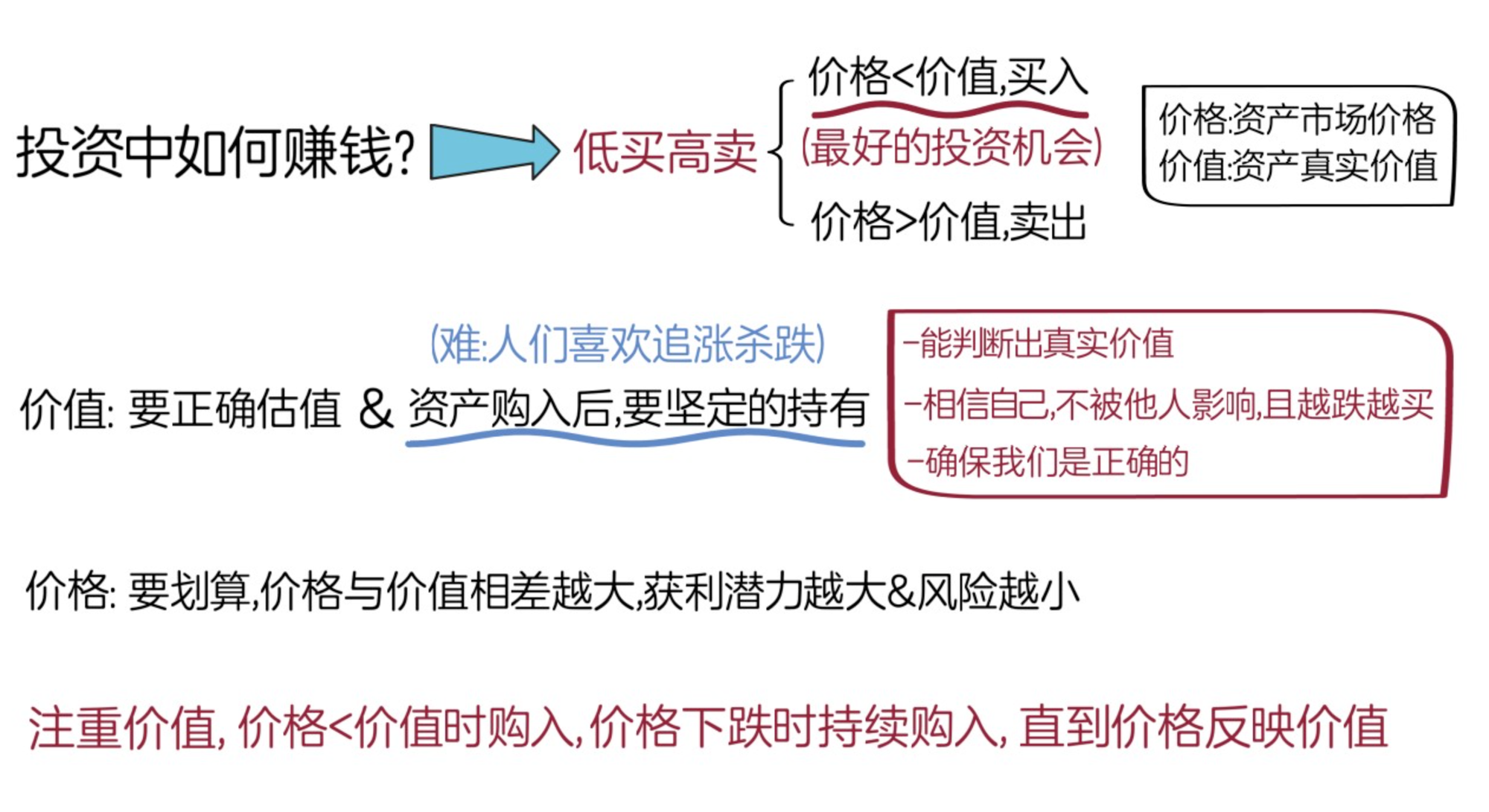 总的来说,霍华德马克斯认为,以低于资产真实价值的价格买入资产,虽然不是万无一失,但是却是我们最好的投资机会,要注重资产的价值,在资产价格低于它的真实价值时购入,长期持有,并在价格下跌时,持续购入,直到资产价格反映其真正价值的时刻。