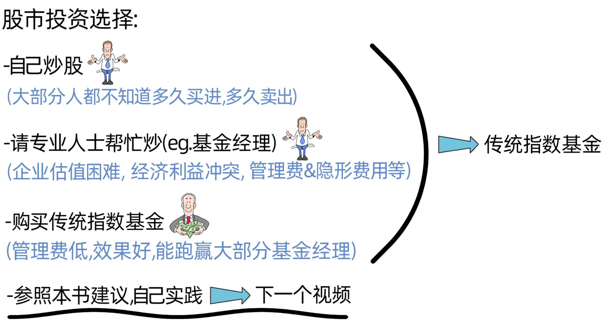 根据这四种选择,我们可以得出两个结论。前三个选择得出的结论就是,如果不想花时间和精力,就购买传统指数基金,也就是今天分享的内容;最后一个选择得出的结论就是,参照作者建议进行实践可以获得超出传统指数基金的回报,这个内容放在下一个分享里面。